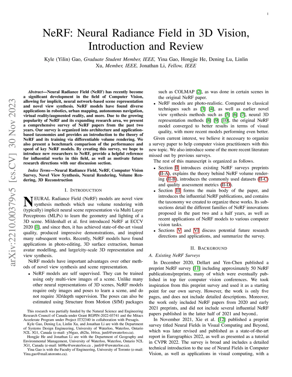 Neural Radiance Field (NeRF) has recently become a significant development in the field of Computer Vision, allowing for implicit, neural network-based scene representation and novel view synthesis. NeRF models have found diverse applications in robotics, urban mapping, autonomous navigation, virtual reality/augmented reality, and more. Due to the growing popularity of NeRF and its expanding research area, we present a comprehensive survey of NeRF papers from the past two years. Our survey is organized into architecture and application-based taxonomies and provides an introduction to the theory of NeRF and its training via differentiable volume rendering. We also present a benchmark comparison of the performance and speed of key NeRF models. By creating this survey, we hope to introduce new researchers to NeRF, provide a helpful reference for influential works in this field, as well as motivate future research directions with our discussion section.