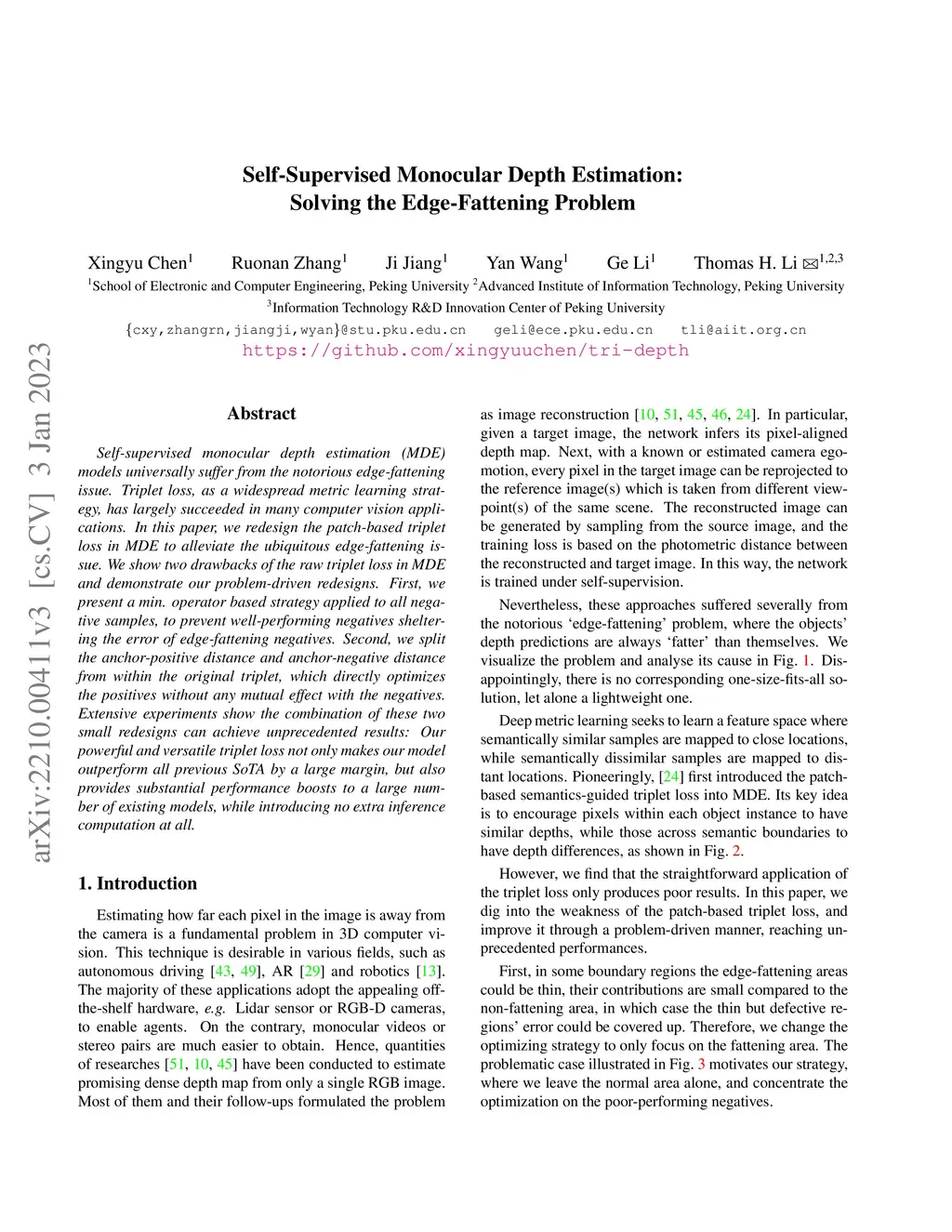 Self-supervised monocular depth estimation (MDE) models universally suffer from the notorious edge-fattening issue. Triplet loss, as a widespread metric learning strategy, has largely succeeded in many computer vision applications. In this paper, we redesign the patch-based triplet loss in MDE to alleviate the ubiquitous edge-fattening issue. We show two drawbacks of the raw triplet loss in MDE and demonstrate our problem-driven redesigns. First, we present a min. operator based strategy applied to all negative samples, to prevent well-performing negatives sheltering the error of edge-fattening negatives. Second, we split the anchor-positive distance and anchor-negative distance from within the original triplet, which directly optimizes the positives without any mutual effect with the negatives. Extensive experiments show the combination of these two small redesigns can achieve unprecedented results: Our powerful and versatile triplet loss not only makes our model outperform all previous SoTA by a large margin, but also provides substantial performance boosts to a large number of existing models, while introducing no extra inference computation at all.