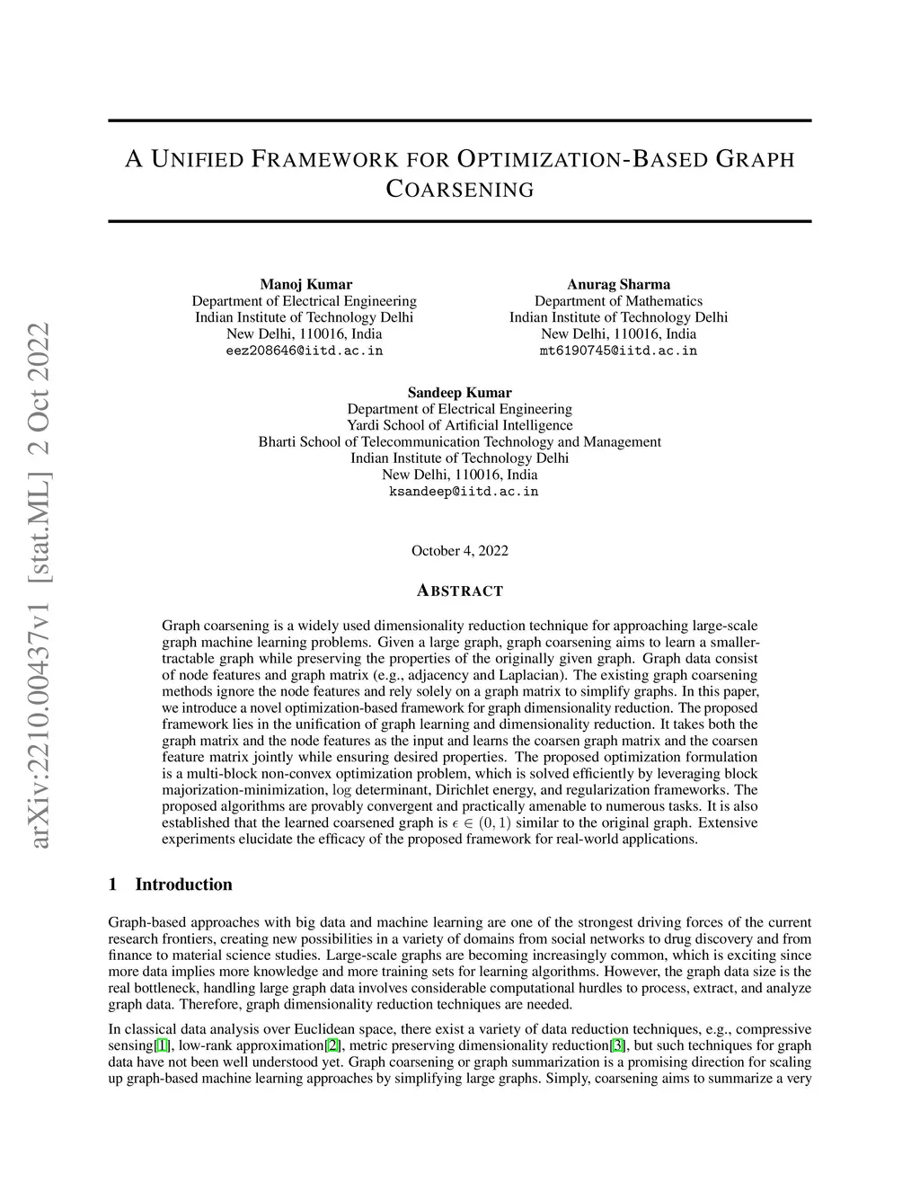 Graph coarsening is a widely used dimensionality reduction technique for approaching large-scale graph machine learning problems. Given a large graph, graph coarsening aims to learn a smaller-tractable graph while preserving the properties of the originally given graph. Graph data consist of node features and graph matrix (e.g., adjacency and Laplacian). The existing graph coarsening methods ignore the node features and rely solely on a graph matrix to simplify graphs. In this paper, we introduce a novel optimization-based framework for graph dimensionality reduction. The proposed framework lies in the unification of graph learning and dimensionality reduction. It takes both the graph matrix and the node features as the input and learns the coarsen graph matrix and the coarsen feature matrix jointly while ensuring desired properties. The proposed optimization formulation is a multi-block non-convex optimization problem, which is solved efficiently by leveraging block majorization-minimization, determinant, Dirichlet energy, and regularization frameworks. The proposed algorithms are provably convergent and practically amenable to numerous tasks. It is also established that the learned coarsened graph is similar to the original graph. Extensive experiments elucidate the efficacy of the proposed framework for real-world applications.