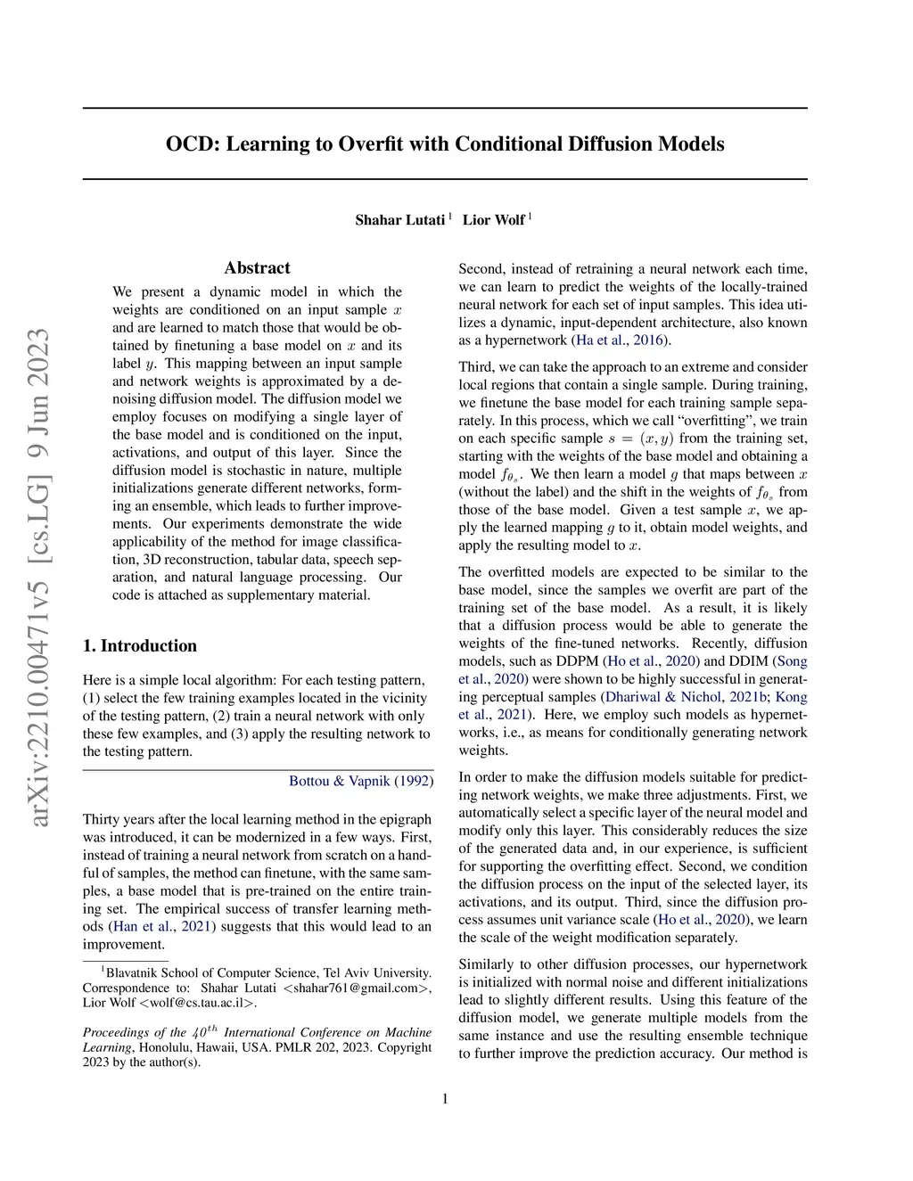 We present a dynamic model in which the weights are conditioned on an input sample x and are learned to match those that would be obtained by finetuning a base model on x and its label y. This mapping between an input sample and network weights is approximated by a denoising diffusion model. The diffusion model we employ focuses on modifying a single layer of the base model and is conditioned on the input, activations, and output of this layer. Since the diffusion model is stochastic in nature, multiple initializations generate different networks, forming an ensemble, which leads to further improvements. Our experiments demonstrate the wide applicability of the method for image classification, 3D reconstruction, tabular data, speech separation, and natural language processing. Our code is available at https://github.com/ShaharLutatiPersonal/OCD
