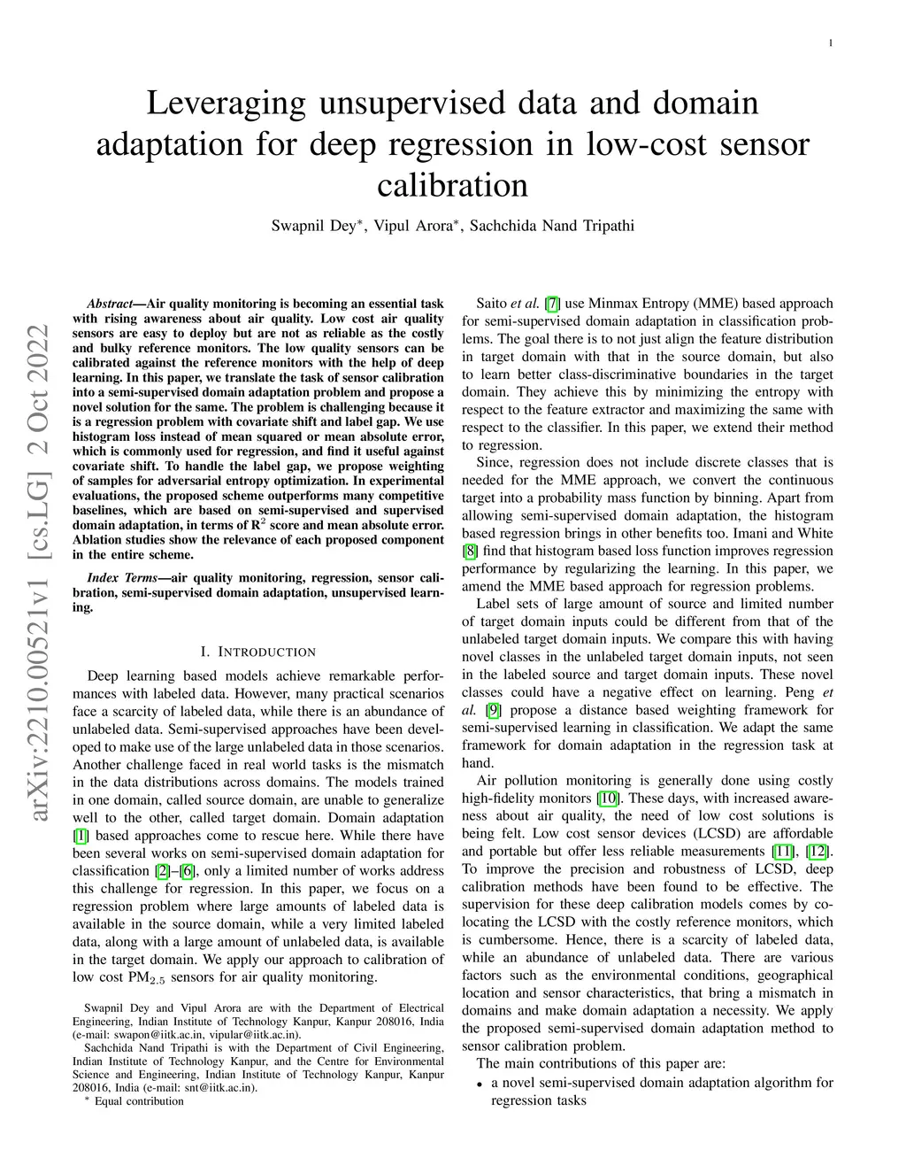 Air quality monitoring is becoming an essential task with rising awareness about air quality. Low cost air quality sensors are easy to deploy but are not as reliable as the costly and bulky reference monitors. The low quality sensors can be calibrated against the reference monitors with the help of deep learning. In this paper, we translate the task of sensor calibration into a semi-supervised domain adaptation problem and propose a novel solution for the same. The problem is challenging because it is a regression problem with covariate shift and label gap. We use histogram loss instead of mean squared or mean absolute error, which is commonly used for regression, and find it useful against covariate shift. To handle the label gap, we propose weighting of samples for adversarial entropy optimization. In experimental evaluations, the proposed scheme outperforms many competitive baselines, which are based on semi-supervised and supervised domain adaptation, in terms of R2 score and mean absolute error. Ablation studies show the relevance of each proposed component in the entire scheme.