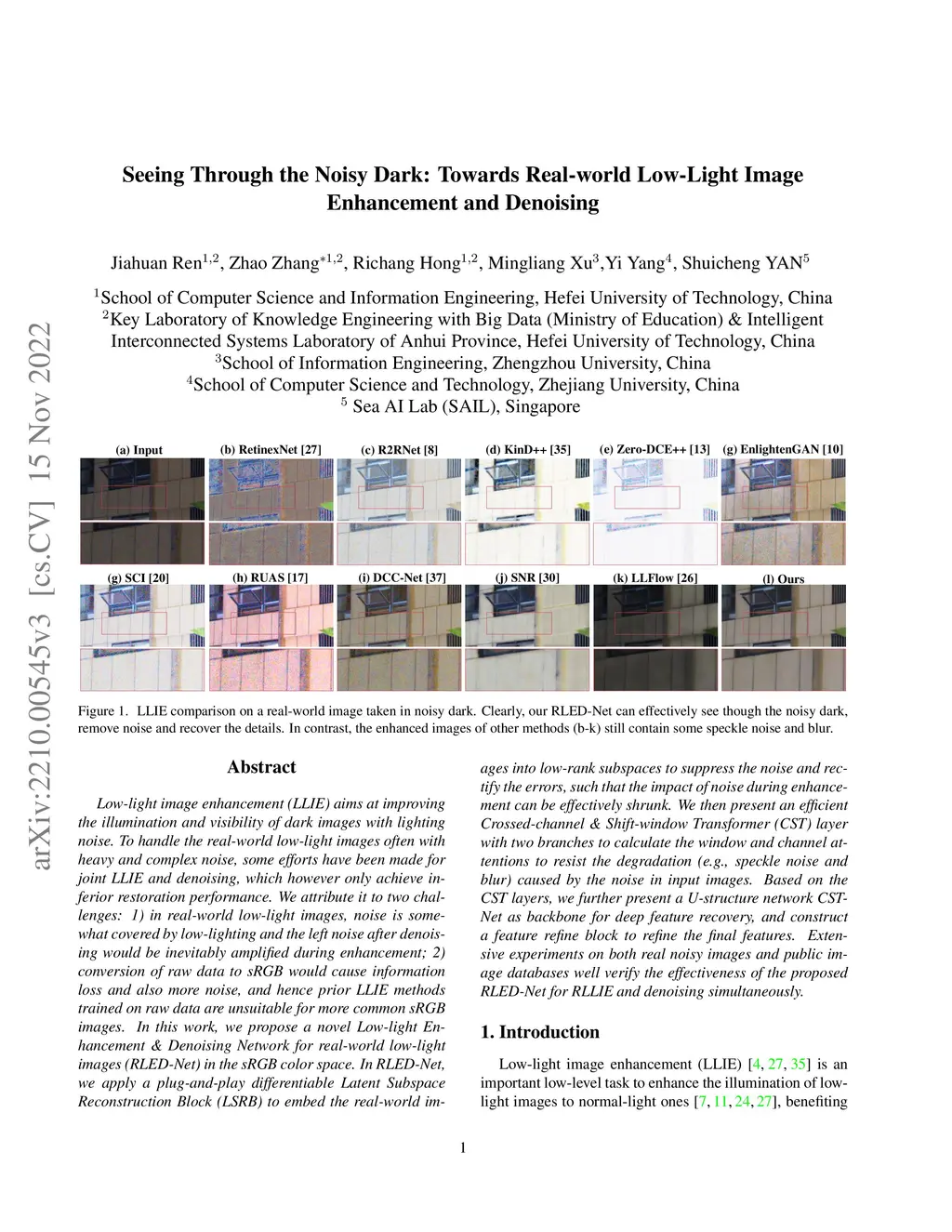 Low-light image enhancement (LLIE) aims at improving the illumination and visibility of dark images with lighting noise. To handle the real-world low-light images often with heavy and complex noise, some efforts have been made for joint LLIE and denoising, which however only achieve inferior restoration performance. We attribute it to two challenges: 1) in real-world low-light images, noise is somewhat covered by low-lighting and the left noise after denoising would be inevitably amplified during enhancement; 2) conversion of raw data to sRGB would cause information loss and also more noise, and hence prior LLIE methods trained on raw data are unsuitable for more common sRGB images. In this work, we propose a novel Low-light Enhancement & Denoising Network for real-world low-light images (RLED-Net) in the sRGB color space. In RLED-Net, we apply a plug-and-play differentiable Latent Subspace Reconstruction Block (LSRB) to embed the real-world images into low-rank subspaces to suppress the noise and rectify the errors, such that the impact of noise during enhancement can be effectively shrunk. We then present an efficient Crossed-channel & Shift-window Transformer (CST) layer with two branches to calculate the window and channel attentions to resist the degradation (e.g., speckle noise and blur) caused by the noise in input images. Based on the CST layers, we further present a U-structure network CSTNet as backbone for deep feature recovery, and construct a feature refine block to refine the final features. Extensive experiments on both real noisy images and public image databases well verify the effectiveness of the proposed RLED-Net for RLLIE and denoising simultaneously.