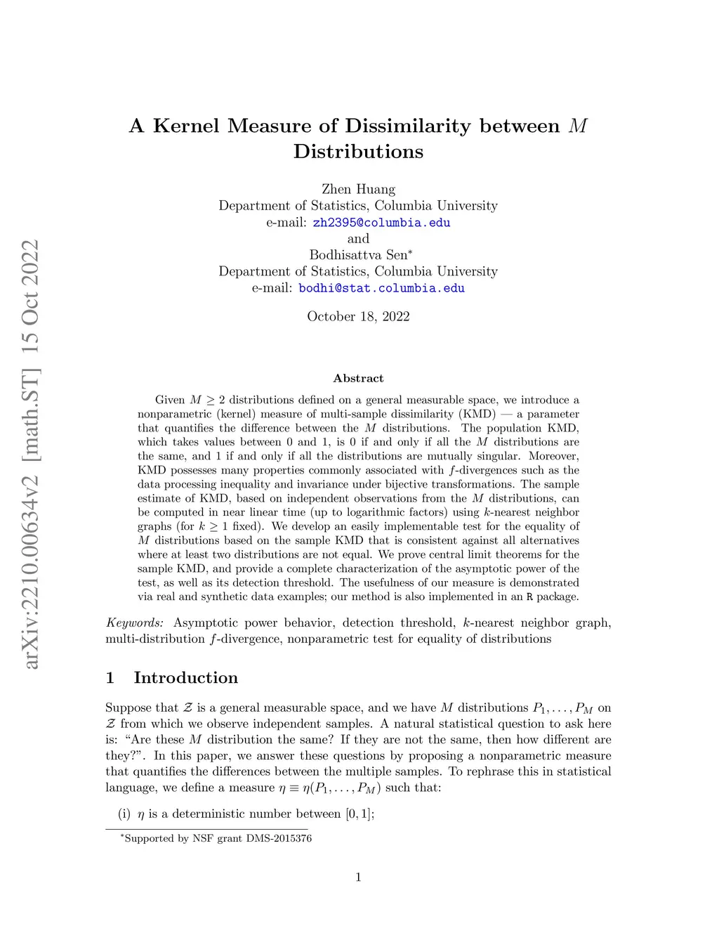 Given distributions defined on a general measurable space, we introduce a nonparametric (kernel) measure of multi-sample dissimilarity (KMD) -- a parameter that quantifies the difference between the distributions. The population KMD, which takes values between 0 and 1, is 0 if and only if all the distributions are the same, and 1 if and only if all the distributions are mutually singular. Moreover, KMD possesses many properties commonly associated with -divergences such as the data processing inequality and invariance under bijective transformations. The sample estimate of KMD, based on independent observations from the distributions, can be computed in near linear time (up to logarithmic factors) using -nearest neighbor graphs (for fixed). We develop an easily implementable test for the equality of distributions based on the sample KMD that is consistent against all alternatives where at least two distributions are not equal. We prove central limit theorems for the sample KMD, and provide a complete characterization of the asymptotic power of the test, as well as its detection threshold. The usefulness of our measure is demonstrated via real and synthetic data examples; our method is also implemented in an R package.