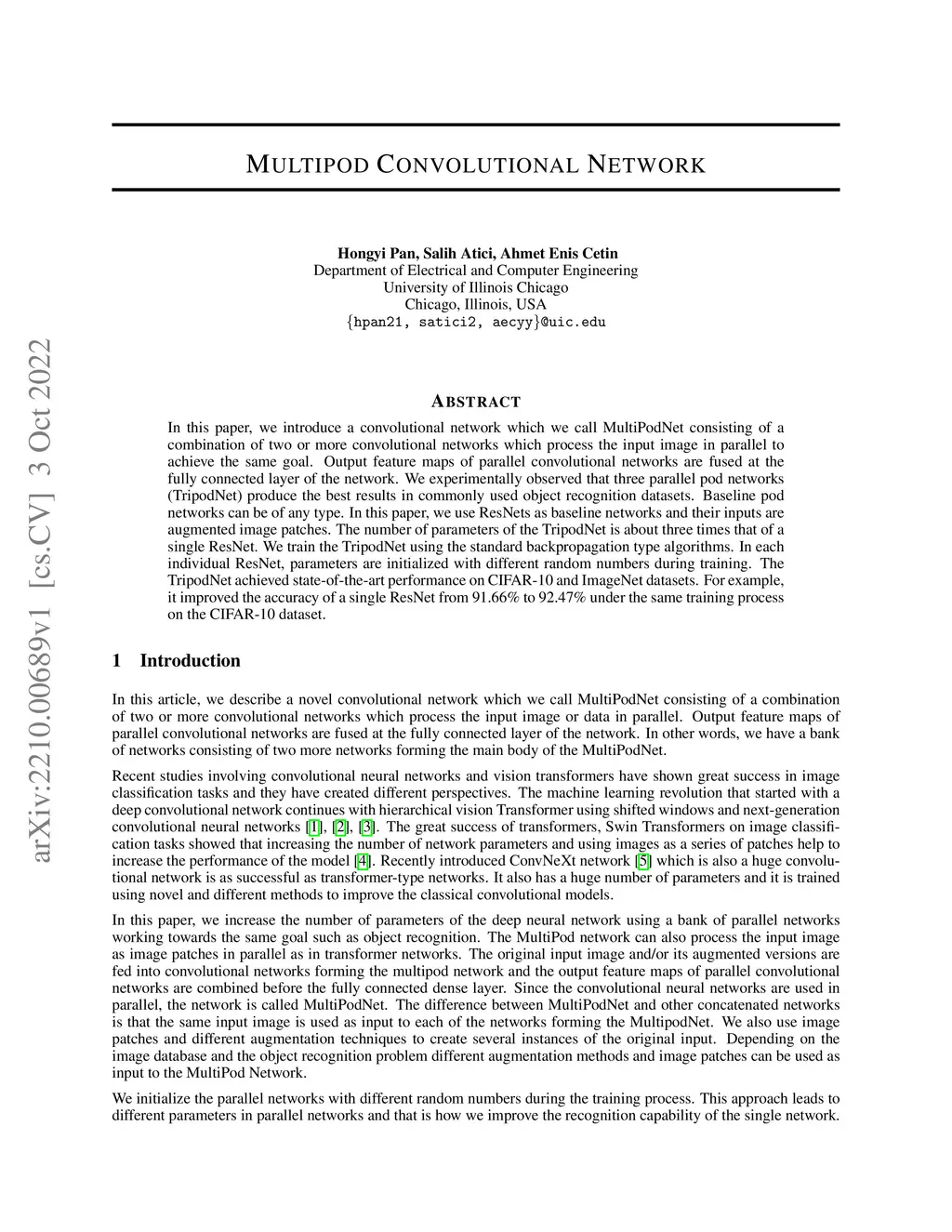 In this paper, we introduce a convolutional network which we call MultiPodNet consisting of a combination of two or more convolutional networks which process the input image in parallel to achieve the same goal. Output feature maps of parallel convolutional networks are fused at the fully connected layer of the network. We experimentally observed that three parallel pod networks (TripodNet) produce the best results in commonly used object recognition datasets. Baseline pod networks can be of any type. In this paper, we use ResNets as baseline networks and their inputs are augmented image patches. The number of parameters of the TripodNet is about three times that of a single ResNet. We train the TripodNet using the standard backpropagation type algorithms. In each individual ResNet, parameters are initialized with different random numbers during training. The TripodNet achieved state-of-the-art performance on CIFAR-10 and ImageNet datasets. For example, it improved the accuracy of a single ResNet from 91.66% to 92.47% under the same training process on the CIFAR-10 dataset.