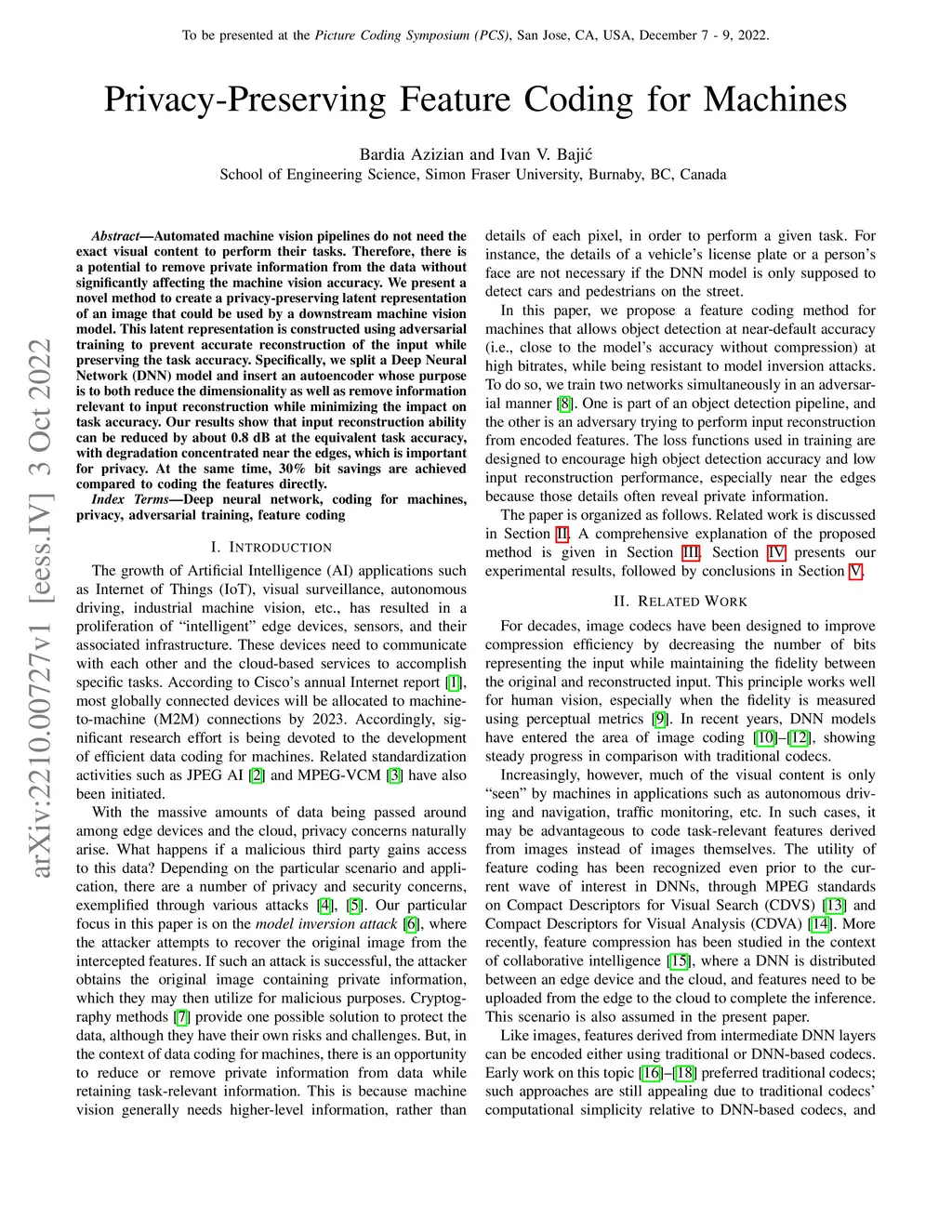 Automated machine vision pipelines do not need the exact visual content to perform their tasks. Therefore, there is a potential to remove private information from the data without significantly affecting the machine vision accuracy. We present a novel method to create a privacy-preserving latent representation of an image that could be used by a downstream machine vision model. This latent representation is constructed using adversarial training to prevent accurate reconstruction of the input while preserving the task accuracy. Specifically, we split a Deep Neural Network (DNN) model and insert an autoencoder whose purpose is to both reduce the dimensionality as well as remove information relevant to input reconstruction while minimizing the impact on task accuracy. Our results show that input reconstruction ability can be reduced by about 0.8 dB at the equivalent task accuracy, with degradation concentrated near the edges, which is important for privacy. At the same time, 30% bit savings are achieved compared to coding the features directly.
