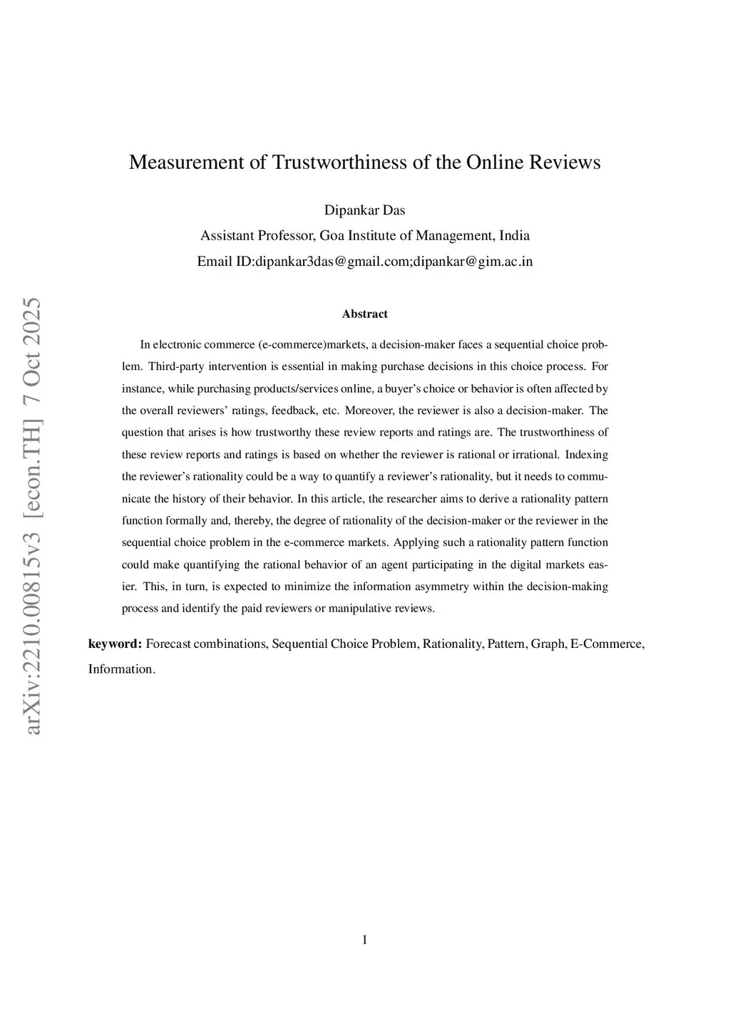 In electronic commerce (e-commerce)markets, a decision-maker faces a sequential choice problem. Third-party intervention is essential in making purchase decisions in this choice process. For instance, while purchasing products/services online, a buyer's choice or behavior is often affected by the overall reviewers' ratings, feedback, etc. Moreover, the reviewer is also a decision-maker. The question that arises is how trustworthy these review reports and ratings are. The trustworthiness of these review reports and ratings is based on whether the reviewer is rational or irrational. Indexing the reviewer's rationality could be a way to quantify a reviewer's rationality, but it needs to communicate the history of their behavior. In this article, the researcher aims to derive a rationality pattern function formally and, thereby, the degree of rationality of the decision-maker or the reviewer in the sequential choice problem in the e-commerce markets. Applying such a rationality pattern function could make quantifying the rational behavior of an agent participating in the digital markets easier. This, in turn, is expected to minimize the information asymmetry within the decision-making process and identify the paid reviewers or manipulative reviews.