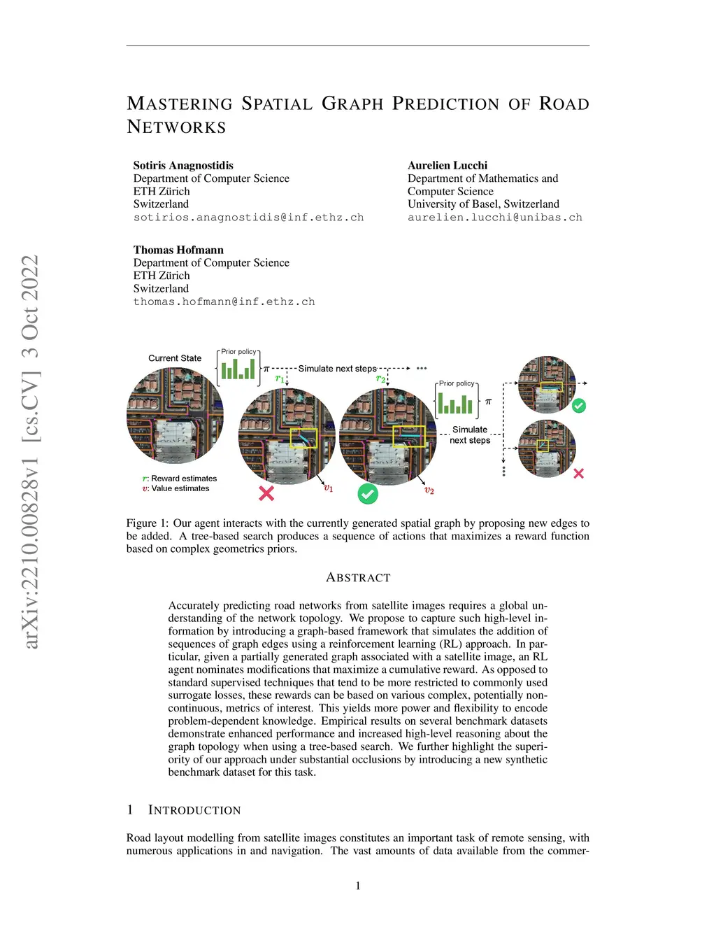 Accurately predicting road networks from satellite images requires a global understanding of the network topology. We propose to capture such high-level information by introducing a graph-based framework that simulates the addition of sequences of graph edges using a reinforcement learning (RL) approach. In particular, given a partially generated graph associated with a satellite image, an RL agent nominates modifications that maximize a cumulative reward. As opposed to standard supervised techniques that tend to be more restricted to commonly used surrogate losses, these rewards can be based on various complex, potentially non-continuous, metrics of interest. This yields more power and flexibility to encode problem-dependent knowledge. Empirical results on several benchmark datasets demonstrate enhanced performance and increased high-level reasoning about the graph topology when using a tree-based search. We further highlight the superiority of our approach under substantial occlusions by introducing a new synthetic benchmark dataset for this task.