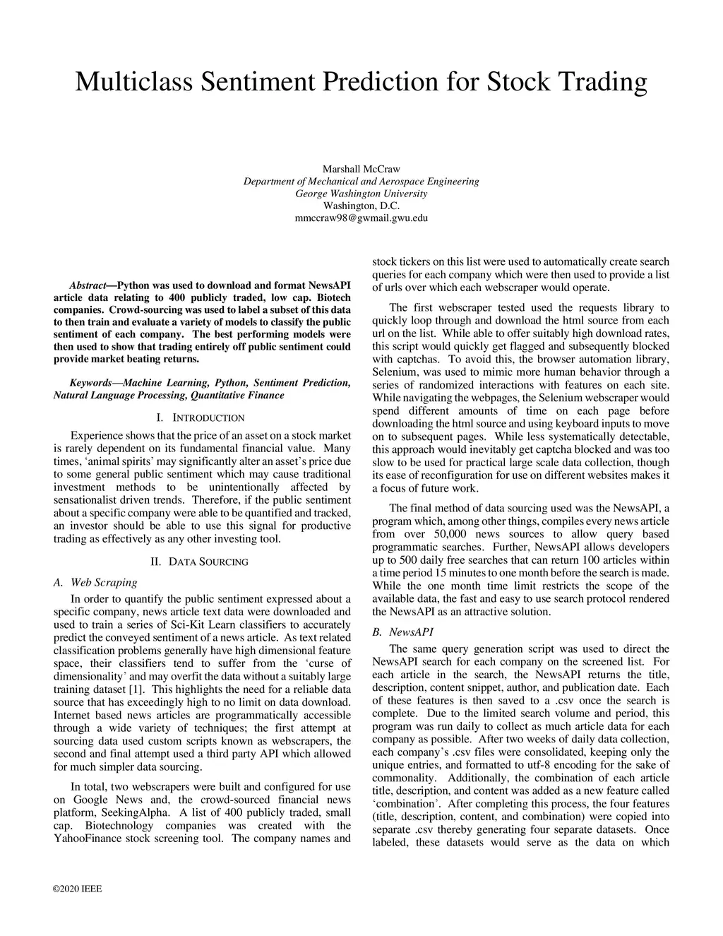 Python was used to download and format NewsAPI article data relating to 400 publicly traded, low cap. Biotech companies. Crowd-sourcing was used to label a subset of this data to then train and evaluate a variety of models to classify the public sentiment of each company. The best performing models were then used to show that trading entirely off public sentiment could provide market beating returns.