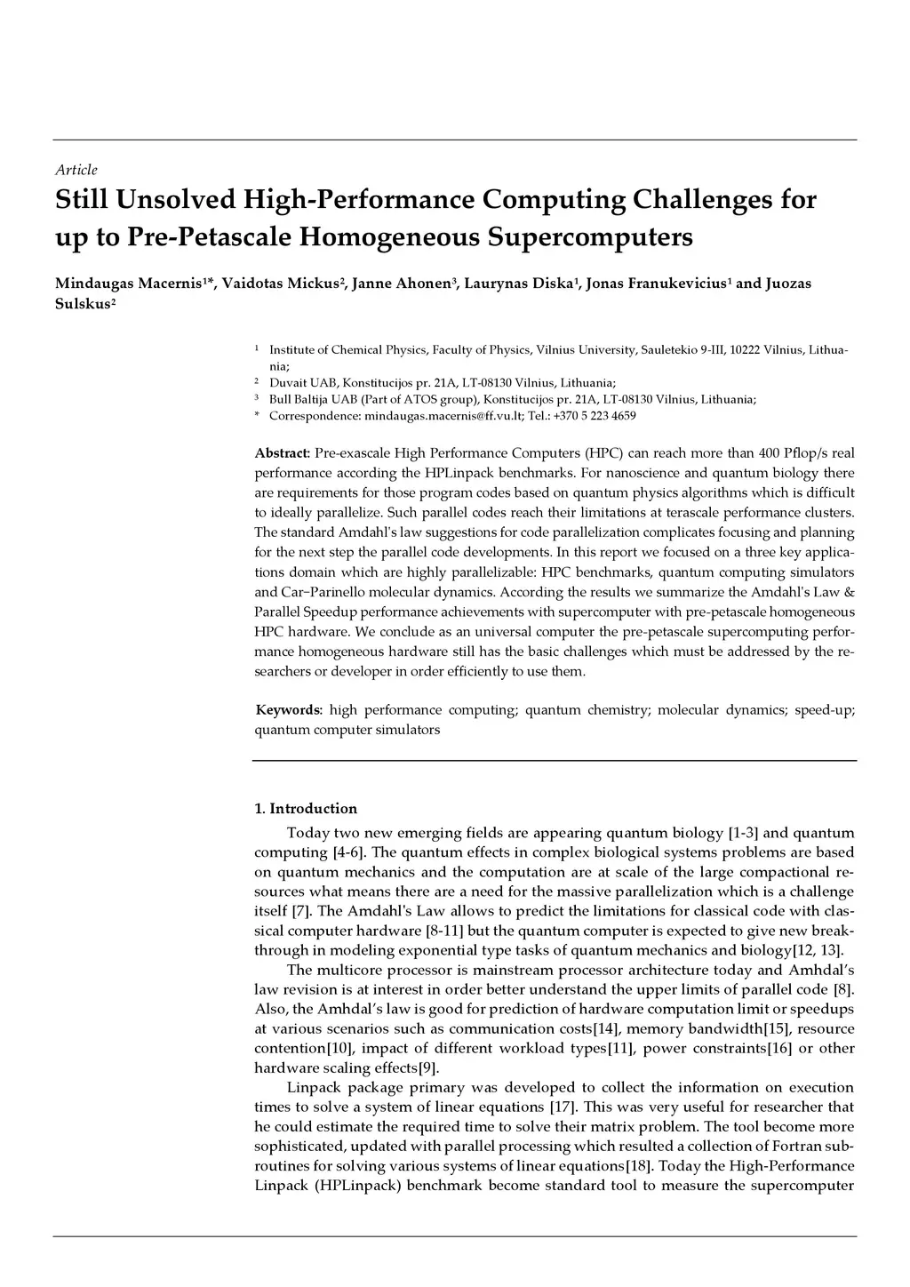 Pre-exascale High Performance Computers (HPC) can reach more than 400 Pflop/s real perfor-mance according the HPLinpack benchmarks. For nanoscience and quantum biology there are requirements for those program codes based on quantum physics algorithms which is difficult to ideally parallelize. Such parallel codes reach their limitations at terascale performance clus-ters. The standard Amdahl's law suggestions for code parallelization complicates focusing and planning for the next step the parallel code developments. In this report we focused on a three key applications domain which are highly parallelizable: HPC benchmarks, quantum compu-ting simulators and Car-Parinello molecular dynamics. According the results we summarize the Amdahl's Law & Parallel Speedup performance achievements with supercomputer with pre-petascale homogeneous HPC hardware. We conclude as an universal computer the pre-petascale supercomputing performance homogeneous hardware still has the basic challeng-es which must be addressed by the researchers or developer in order efficiently to use them.