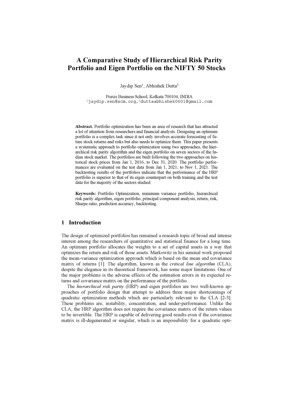 Portfolio optimization has been an area of research that has attracted a lot of attention from researchers and financial analysts. Designing an optimum portfolio is a complex task since it not only involves accurate forecasting of future stock returns and risks but also needs to optimize them. This paper presents a systematic approach to portfolio optimization using two approaches, the hierarchical risk parity algorithm and the Eigen portfolio on seven sectors of the Indian stock market. The portfolios are built following the two approaches to historical stock prices from Jan 1, 2016, to Dec 31, 2020. The portfolio performances are evaluated on the test data from Jan 1, 2021, to Nov 1, 2021. The backtesting results of the portfolios indicate that the performance of the HRP portfolio is superior to that of its Eigen counterpart on both training and test data for the majority of the sectors studied.