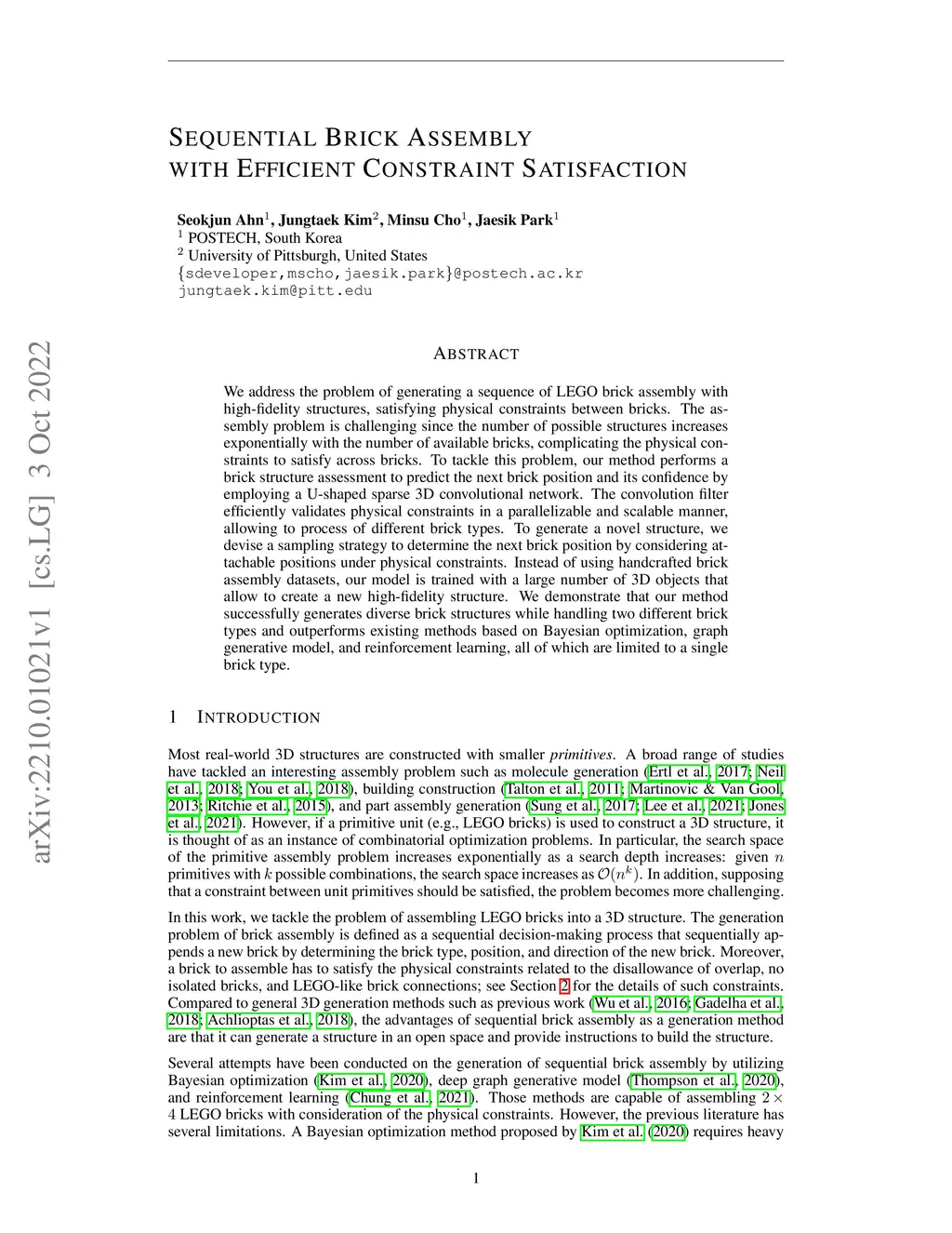 We address the problem of generating a sequence of LEGO brick assembly with high-fidelity structures, satisfying physical constraints between bricks. The assembly problem is challenging since the number of possible structures increases exponentially with the number of available bricks, complicating the physical constraints to satisfy across bricks. To tackle this problem, our method performs a brick structure assessment to predict the next brick position and its confidence by employing a U-shaped sparse 3D convolutional network. The convolution filter efficiently validates physical constraints in a parallelizable and scalable manner, allowing to process of different brick types. To generate a novel structure, we devise a sampling strategy to determine the next brick position by considering attachable positions under physical constraints. Instead of using handcrafted brick assembly datasets, our model is trained with a large number of 3D objects that allow to create a new high-fidelity structure. We demonstrate that our method successfully generates diverse brick structures while handling two different brick types and outperforms existing methods based on Bayesian optimization, graph generative model, and reinforcement learning, all of which are limited to a single brick type.