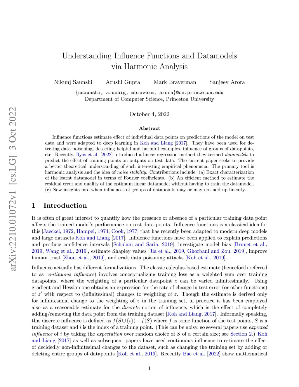 Influence functions estimate effect of individual data points on predictions of the model on test data and were adapted to deep learning in Koh and Liang [2017]. They have been used for detecting data poisoning, detecting helpful and harmful examples, influence of groups of datapoints, etc. Recently, Ilyas et al. [2022] introduced a linear regression method they termed datamodels to predict the effect of training points on outputs on test data. The current paper seeks to provide a better theoretical understanding of such interesting empirical phenomena. The primary tool is harmonic analysis and the idea of noise stability. Contributions include: (a) Exact characterization of the learnt datamodel in terms of Fourier coefficients. (b) An efficient method to estimate the residual error and quality of the optimum linear datamodel without having to train the datamodel. (c) New insights into when influences of groups of datapoints may or may not add up linearly.