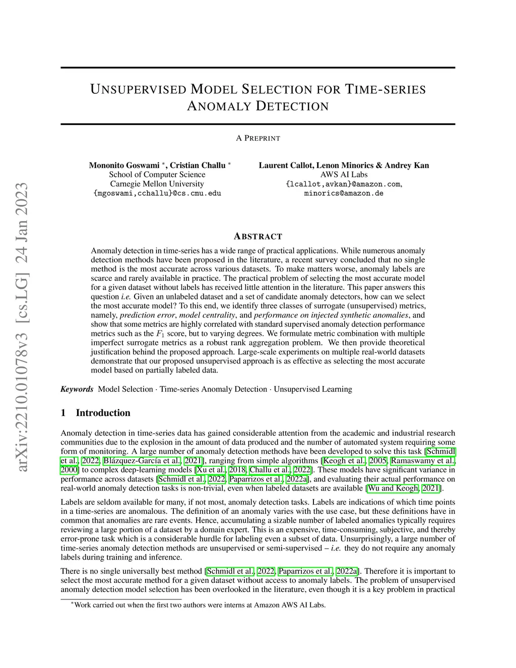 Anomaly detection in time-series has a wide range of practical applications. While numerous anomaly detection methods have been proposed in the literature, a recent survey concluded that no single method is the most accurate across various datasets. To make matters worse, anomaly labels are scarce and rarely available in practice. The practical problem of selecting the most accurate model for a given dataset without labels has received little attention in the literature. This paper answers this question i.e. Given an unlabeled dataset and a set of candidate anomaly detectors, how can we select the most accurate model? To this end, we identify three classes of surrogate (unsupervised) metrics, namely, prediction error, model centrality, and performance on injected synthetic anomalies, and show that some metrics are highly correlated with standard supervised anomaly detection performance metrics such as the score, but to varying degrees. We formulate metric combination with multiple imperfect surrogate metrics as a robust rank aggregation problem. We then provide theoretical justification behind the proposed approach. Large-scale experiments on multiple real-world datasets demonstrate that our proposed unsupervised approach is as effective as selecting the most accurate model based on partially labeled data.