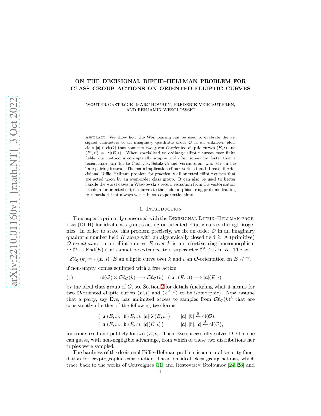 We show how the Weil pairing can be used to evaluate the assigned characters of an imaginary quadratic order in an unknown ideal class that connects two given -oriented elliptic curves and . When specialized to ordinary elliptic curves over finite fields, our method is conceptually simpler and often somewhat faster than a recent approach due to Castryck, Sot\ákov\á and Vercauteren, who rely on the Tate pairing instead. The main implication of our work is that it breaks the decisional Diffie-Hellman problem for practically all oriented elliptic curves that are acted upon by an even-order class group. It can also be used to better handle the worst cases in Wesolowski's recent reduction from the vectorization problem for oriented elliptic curves to the endomorphism ring problem, leading to a method that always works in sub-exponential time.