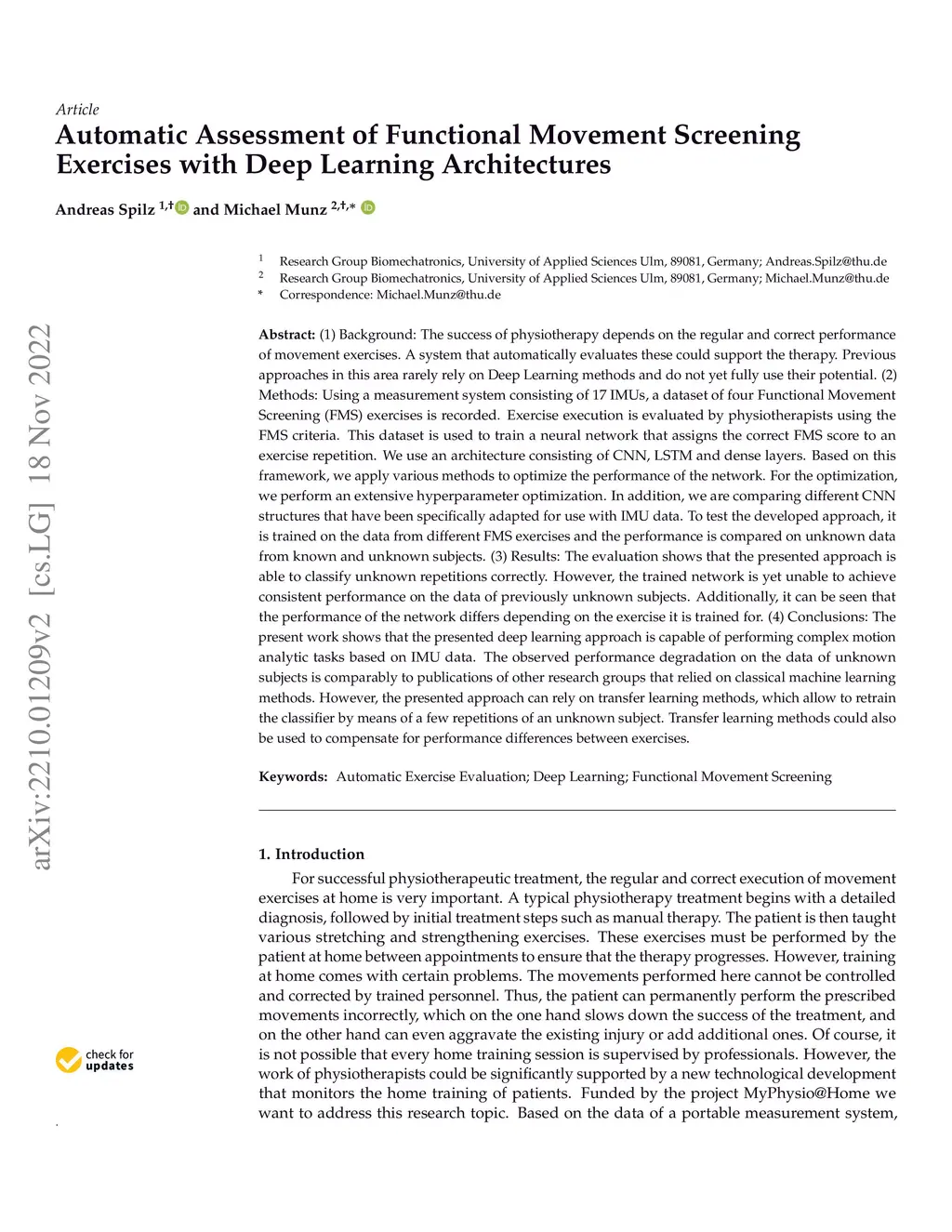 (1) Background: The success of physiotherapy depends on the regular and correct performance of movement exercises. A system that automatically evaluates these could support the therapy. Previous approaches in this area rarely rely on Deep Learning methods and do not yet fully use their potential. (2) Methods: Using a measurement system consisting of 17 IMUs, a dataset of four Functional Movement Screening (FMS) exercises is recorded. Exercise execution is evaluated by physiotherapists using the FMS criteria. This dataset is used to train a neural network that assigns the correct FMS score to an exercise repetition. We use an architecture consisting of CNN, LSTM and Dense layers. Based on this framework, we apply various methods to optimize the performance of the network. For the optimization, we perform a extensive hyperparameter optimization. In addition, we are comparing different CNN structures that have been specifically adapted for use with IMU data. Finally, the developed network is trained with the data of different FMS exercises and the performance is compared. (3) Results: The evaluation shows that the presented approach achieves a convincing performance in the classification of unknown repetitions of already known subjects. However, the trained network is yet unable to achieve consistent performance on the data of a previously unknown subjects. Additionally, it can be seen that the performance of the network differs significantly depending on the exercise it is trained for.