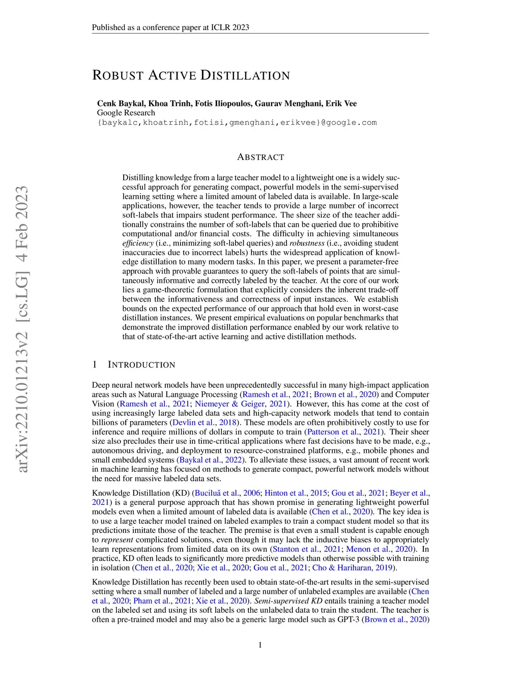 Distilling knowledge from a large teacher model to a lightweight one is a widely successful approach for generating compact, powerful models in the semi-supervised learning setting where a limited amount of labeled data is available. In large-scale applications, however, the teacher tends to provide a large number of incorrect soft-labels that impairs student performance. The sheer size of the teacher additionally constrains the number of soft-labels that can be queried due to prohibitive computational and/or financial costs. The difficulty in achieving simultaneous \emph{efficiency} (i.e., minimizing soft-label queries) and \emph{robustness} (i.e., avoiding student inaccuracies due to incorrect labels) hurts the widespread application of knowledge distillation to many modern tasks. In this paper, we present a parameter-free approach with provable guarantees to query the soft-labels of points that are simultaneously informative and correctly labeled by the teacher. At the core of our work lies a game-theoretic formulation that explicitly considers the inherent trade-off between the informativeness and correctness of input instances. We establish bounds on the expected performance of our approach that hold even in worst-case distillation instances. We present empirical evaluations on popular benchmarks that demonstrate the improved distillation performance enabled by our work relative to that of state-of-the-art active learning and active distillation methods.