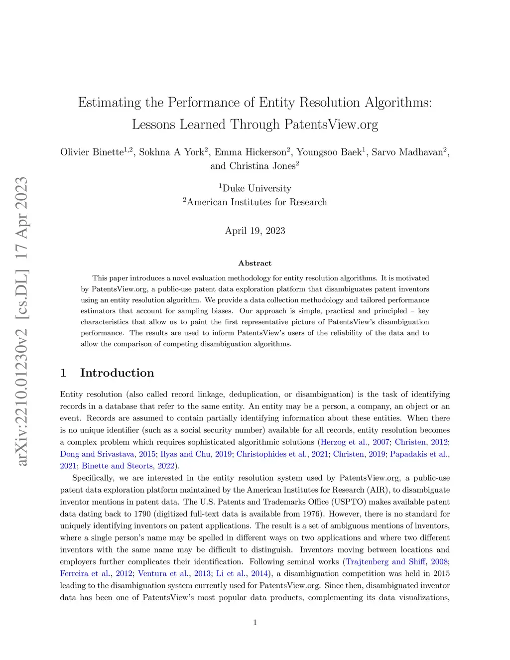 This paper introduces a novel evaluation methodology for entity resolution algorithms. It is motivated by PatentsView.org, a U.S. Patents and Trademarks Office patent data exploration tool that disambiguates patent inventors using an entity resolution algorithm. We provide a data collection methodology and tailored performance estimators that account for sampling biases. Our approach is simple, practical and principled -- key characteristics that allow us to paint the first representative picture of PatentsView's disambiguation performance. This approach is used to inform PatentsView's users of the reliability of the data and to allow the comparison of competing disambiguation algorithms.