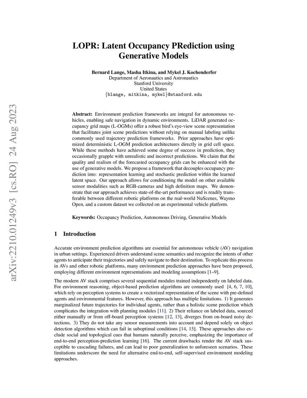 Environment prediction frameworks are integral for autonomous vehicles, enabling safe navigation in dynamic environments. LiDAR generated occupancy grid maps (L-OGMs) offer a robust bird's eye-view scene representation that facilitates joint scene predictions without relying on manual labeling unlike commonly used trajectory prediction frameworks. Prior approaches have optimized deterministic L-OGM prediction architectures directly in grid cell space. While these methods have achieved some degree of success in prediction, they occasionally grapple with unrealistic and incorrect predictions. We claim that the quality and realism of the forecasted occupancy grids can be enhanced with the use of generative models. We propose a framework that decouples occupancy prediction into: representation learning and stochastic prediction within the learned latent space. Our approach allows for conditioning the model on other available sensor modalities such as RGB-cameras and high definition maps. We demonstrate that our approach achieves state-of-the-art performance and is readily transferable between different robotic platforms on the real-world NuScenes, Waymo Open, and a custom dataset we collected on an experimental vehicle platform.