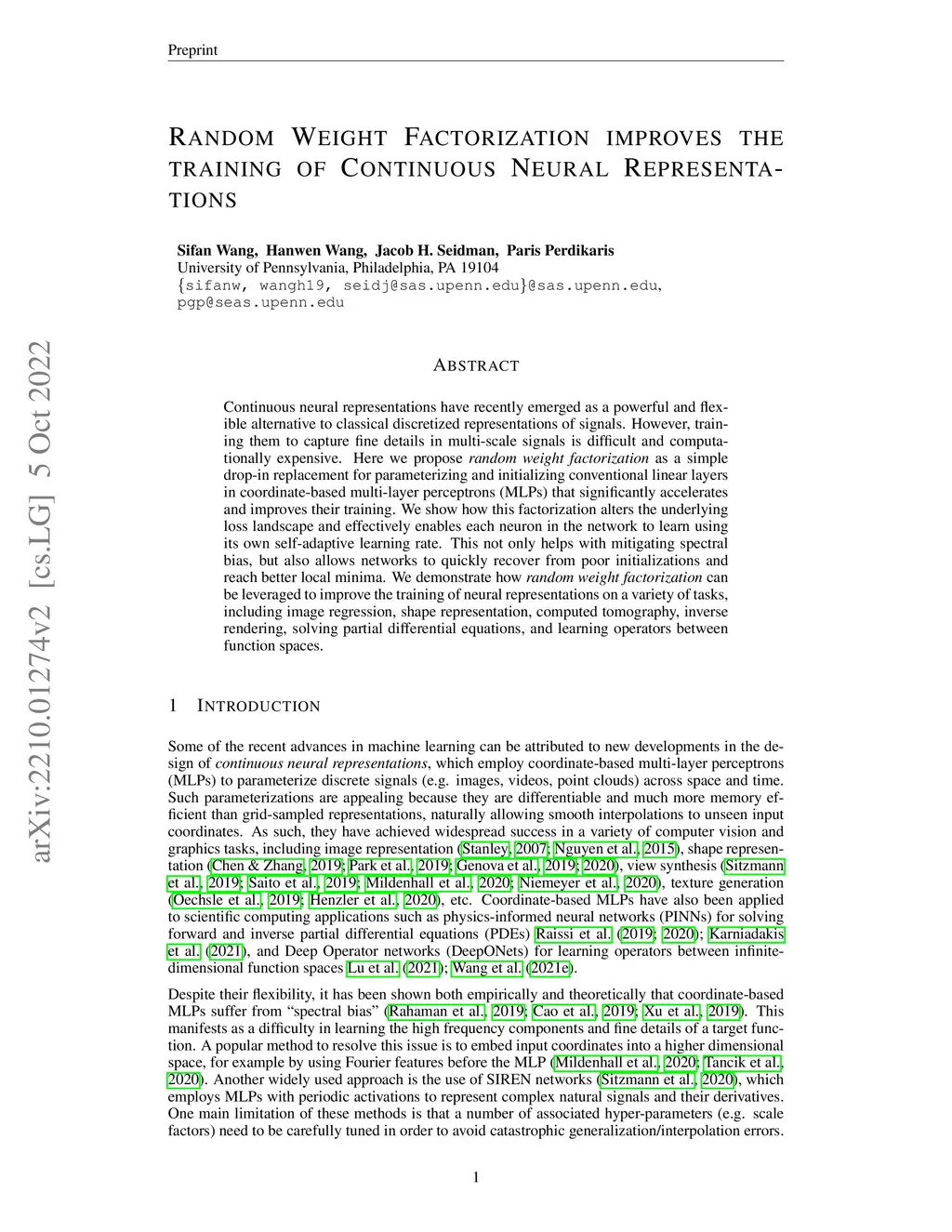 Continuous neural representations have recently emerged as a powerful and flexible alternative to classical discretized representations of signals. However, training them to capture fine details in multi-scale signals is difficult and computationally expensive. Here we propose random weight factorization as a simple drop-in replacement for parameterizing and initializing conventional linear layers in coordinate-based multi-layer perceptrons (MLPs) that significantly accelerates and improves their training. We show how this factorization alters the underlying loss landscape and effectively enables each neuron in the network to learn using its own self-adaptive learning rate. This not only helps with mitigating spectral bias, but also allows networks to quickly recover from poor initializations and reach better local minima. We demonstrate how random weight factorization can be leveraged to improve the training of neural representations on a variety of tasks, including image regression, shape representation, computed tomography, inverse rendering, solving partial differential equations, and learning operators between function spaces.