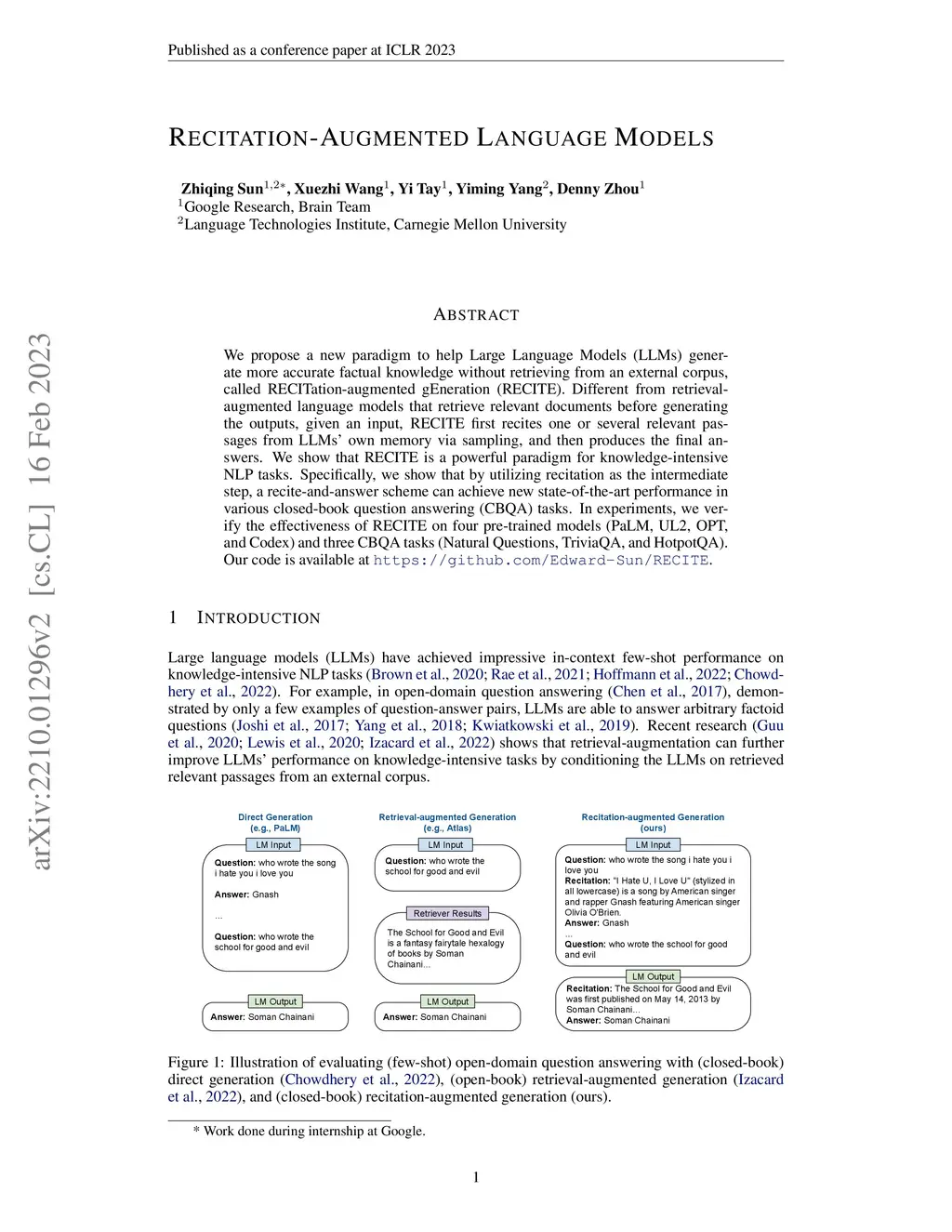 We propose a new paradigm to help Large Language Models (LLMs) generate more accurate factual knowledge without retrieving from an external corpus, called RECITation-augmented gEneration (RECITE). Different from retrieval-augmented language models that retrieve relevant documents before generating the outputs, given an input, RECITE first recites one or several relevant passages from LLMs' own memory via sampling, and then produces the final answers. We show that RECITE is a powerful paradigm for knowledge-intensive NLP tasks. Specifically, we show that by utilizing recitation as the intermediate step, a recite-and-answer scheme can achieve new state-of-the-art performance in various closed-book question answering (CBQA) tasks. In experiments, we verify the effectiveness of \method~on four pre-trained models (PaLM, UL2, OPT, and Codex) and three CBQA tasks (Natural Questions, TriviaQA, and HotpotQA). Our code is available at "https://github.com/Edward-Sun/RECITE".