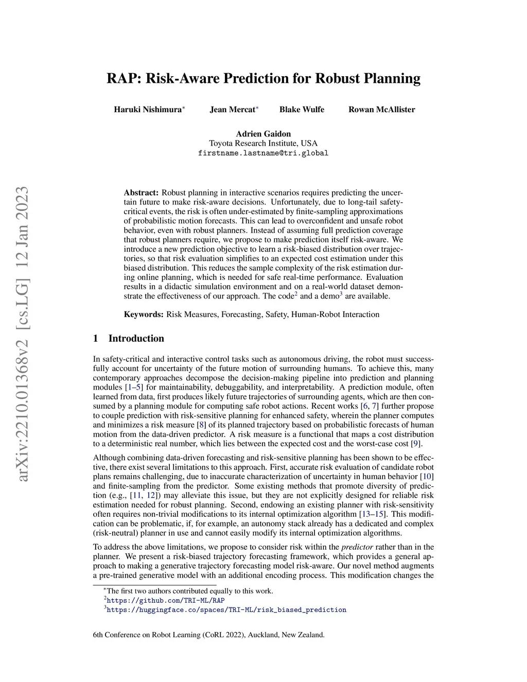 Robust planning in interactive scenarios requires predicting the uncertain future to make risk-aware decisions. Unfortunately, due to long-tail safety-critical events, the risk is often under-estimated by finite-sampling approximations of probabilistic motion forecasts. This can lead to overconfident and unsafe robot behavior, even with robust planners. Instead of assuming full prediction coverage that robust planners require, we propose to make prediction itself risk-aware. We introduce a new prediction objective to learn a risk-biased distribution over trajectories, so that risk evaluation simplifies to an expected cost estimation under this biased distribution. This reduces the sample complexity of the risk estimation during online planning, which is needed for safe real-time performance. Evaluation results in a didactic simulation environment and on a real-world dataset demonstrate the effectiveness of our approach. The code and a demo are available.