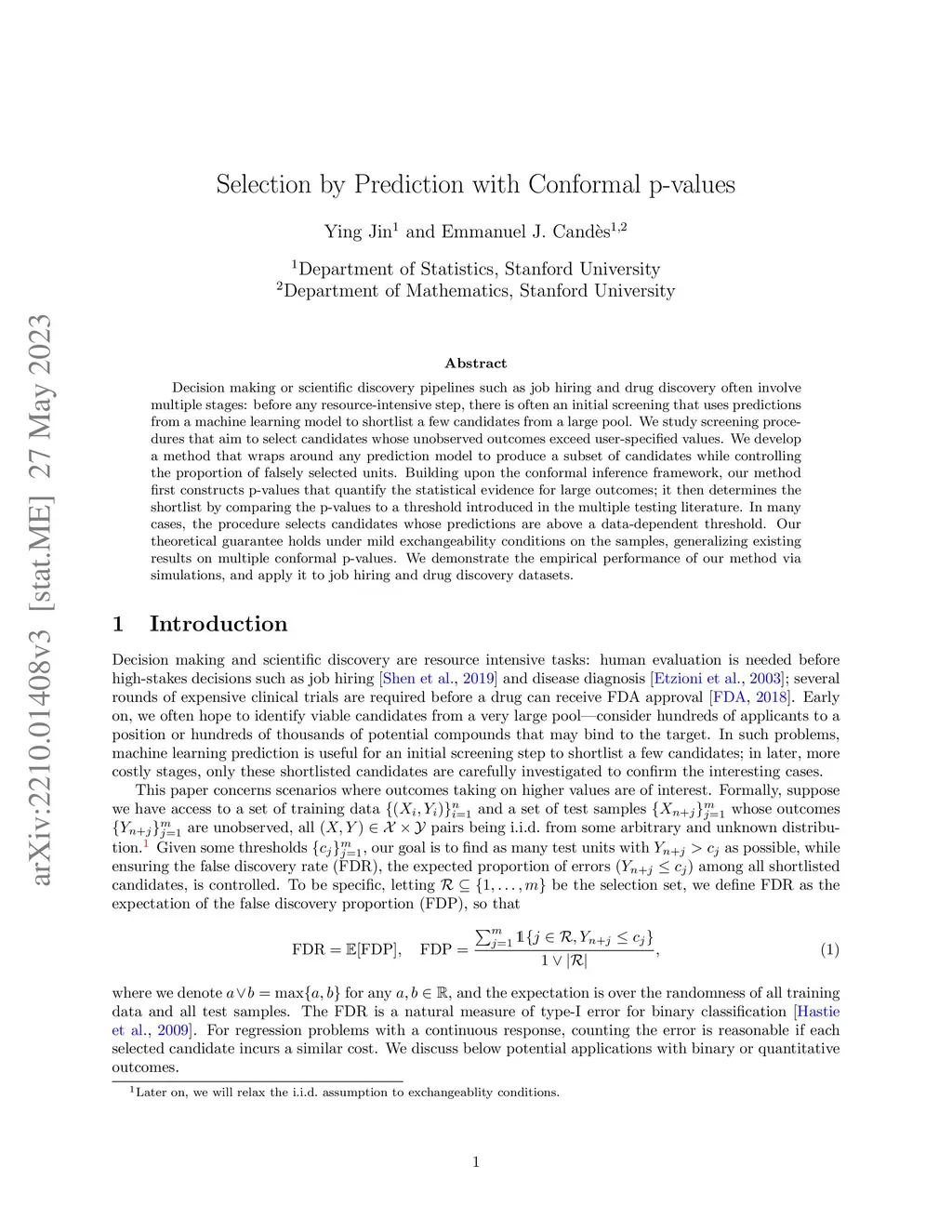 Decision making or scientific discovery pipelines such as job hiring and drug discovery often involve multiple stages: before any resource-intensive step, there is often an initial screening that uses predictions from a machine learning model to shortlist a few candidates from a large pool. We study screening procedures that aim to select candidates whose unobserved outcomes exceed user-specified values. We develop a method that wraps around any prediction model to produce a subset of candidates while controlling the proportion of falsely selected units. Building upon the conformal inference framework, our method first constructs p-values that quantify the statistical evidence for large outcomes; it then determines the shortlist by comparing the p-values to a threshold introduced in the multiple testing literature. In many cases, the procedure selects candidates whose predictions are above a data-dependent threshold. Our theoretical guarantee holds under mild exchangeability conditions on the samples, generalizing existing results on multiple conformal p-values. We demonstrate the empirical performance of our method via simulations, and apply it to job hiring and drug discovery datasets.