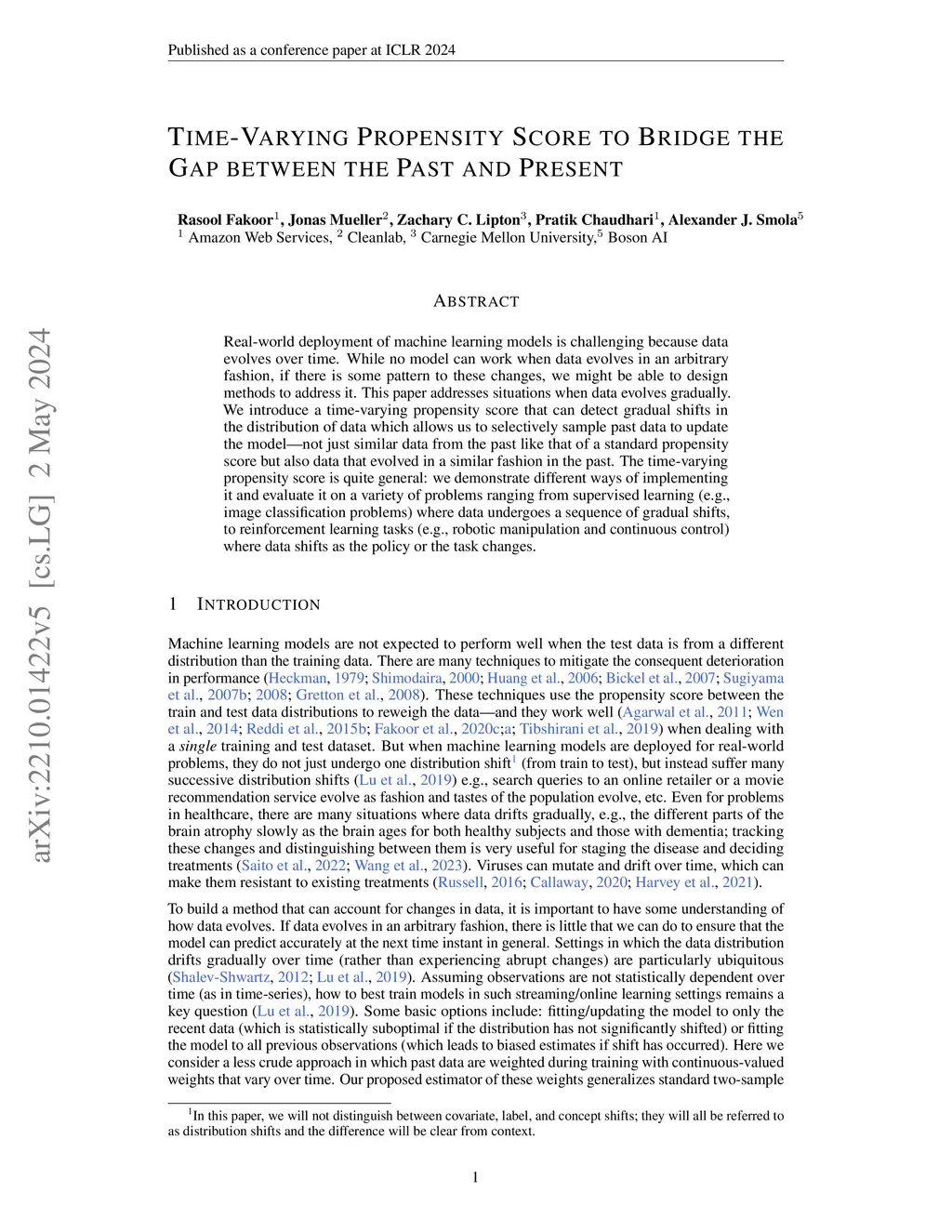 Real-world deployment of machine learning models is challenging because data evolves over time. While no model can work when data evolves in an arbitrary fashion, if there is some pattern to these changes, we might be able to design methods to address it. This paper addresses situations when data evolves gradually. We introduce a time-varying propensity score that can detect gradual shifts in the distribution of data which allows us to selectively sample past data to update the model -- not just similar data from the past like that of a standard propensity score but also data that evolved in a similar fashion in the past. The time-varying propensity score is quite general: we demonstrate different ways of implementing it and evaluate it on a variety of problems ranging from supervised learning (e.g., image classification problems) where data undergoes a sequence of gradual shifts, to reinforcement learning tasks (e.g., robotic manipulation and continuous control) where data shifts as the policy or the task changes.