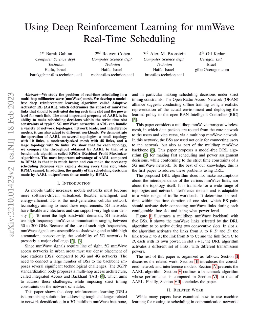 We study the problem of real-time scheduling in a multi-hop millimeter-wave (mmWave) mesh. We develop a model-free deep reinforcement learning algorithm called Adaptive Activator RL (AARL), which determines the subset of mmWave links that should be activated during each time slot and the power level for each link. The most important property of AARL is its ability to make scheduling decisions within the strict time slot constraints of typical 5G mmWave networks. AARL can handle a variety of network topologies, network loads, and interference models, it can also adapt to different workloads. We demonstrate the operation of AARL on several topologies: a small topology with 10 links, a moderately-sized mesh with 48 links, and a large topology with 96 links. We show that for each topology, we compare the throughput obtained by AARL to that of a benchmark algorithm called RPMA (Residual Profit Maximizer Algorithm). The most important advantage of AARL compared to RPMA is that it is much faster and can make the necessary scheduling decisions very rapidly during every time slot, while RPMA cannot. In addition, the quality of the scheduling decisions made by AARL outperforms those made by RPMA.