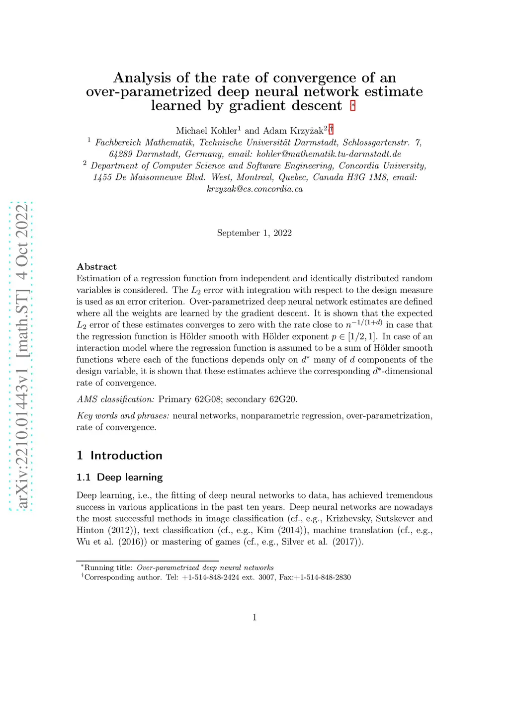 Estimation of a regression function from independent and identically distributed random variables is considered. The error with integration with respect to the design measure is used as an error criterion. Over-parametrized deep neural network estimates are defined where all the weights are learned by the gradient descent. It is shown that the expected error of these estimates converges to zero with the rate close to in case that the regression function is H\"older smooth with H\"older exponent . In case of an interaction model where the regression function is assumed to be a sum of H\"older smooth functions where each of the functions depends only on many of components of the design variable, it is shown that these estimates achieve the corresponding -dimensional rate of convergence.