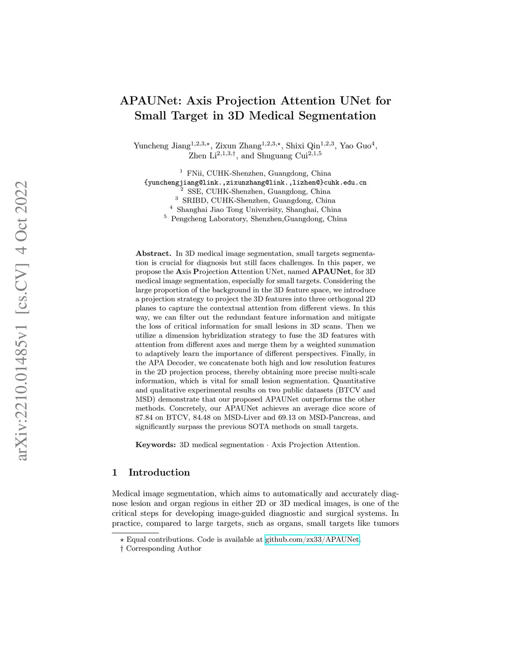 APAUNet: Axis Projection Attention UNet for Small Target in 3D Medical