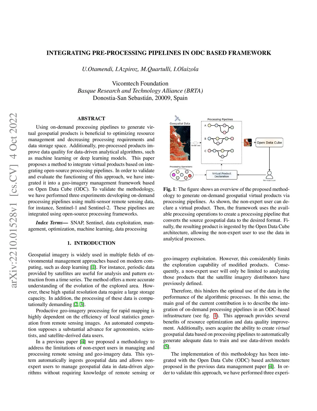 Using on-demand processing pipelines to generate virtual geospatial products is beneficial to optimizing resource management and decreasing processing requirements and data storage space. Additionally, pre-processed products improve data quality for data-driven analytical algorithms, such as machine learning or deep learning models. This paper proposes a method to integrate virtual products based on integrating open-source processing pipelines. In order to validate and evaluate the functioning of this approach, we have integrated it into a geo-imagery management framework based on Open Data Cube (ODC). To validate the methodology, we have performed three experiments developing on-demand processing pipelines using multi-sensor remote sensing data, for instance, Sentinel-1 and Sentinel-2. These pipelines are integrated using open-source processing frameworks.