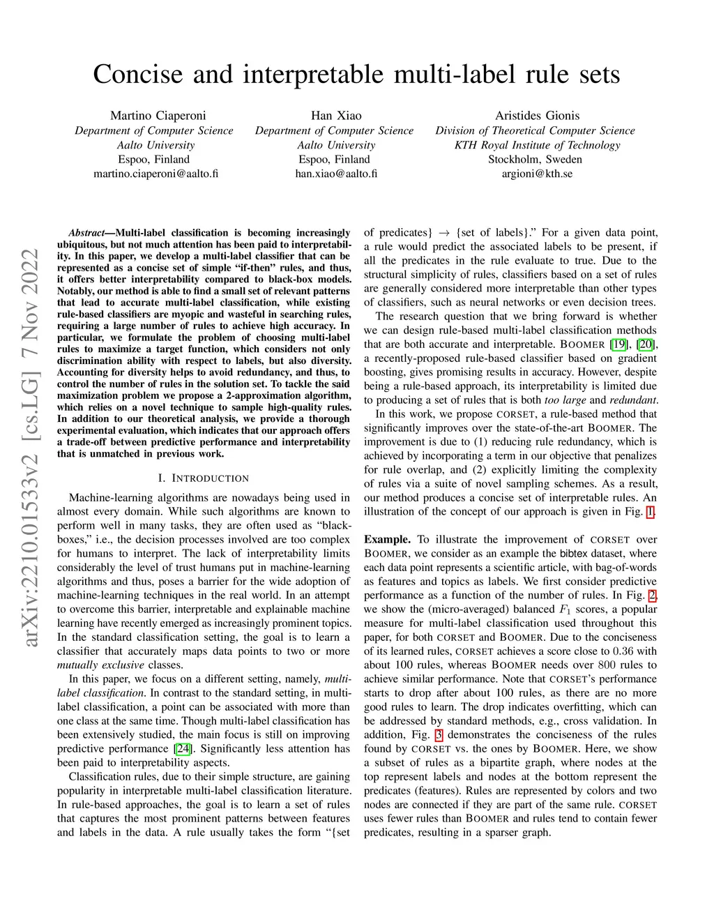 Multi-label classification is becoming increasingly ubiquitous, but not much attention has been paid to interpretability. In this paper, we develop a multi-label classifier that can be represented as a concise set of simple "if-then" rules, and thus, it offers better interpretability compared to black-box models. Notably, our method is able to find a small set of relevant patterns that lead to accurate multi-label classification, while existing rule-based classifiers are myopic and wasteful in searching rules,requiring a large number of rules to achieve high accuracy. In particular, we formulate the problem of choosing multi-label rules to maximize a target function, which considers not only discrimination ability with respect to labels, but also diversity. Accounting for diversity helps to avoid redundancy, and thus, to control the number of rules in the solution set. To tackle the said maximization problem we propose a 2-approximation algorithm, which relies on a novel technique to sample high-quality rules. In addition to our theoretical analysis, we provide a thorough experimental evaluation, which indicates that our approach offers a trade-off between predictive performance and interpretability that is unmatched in previous work.