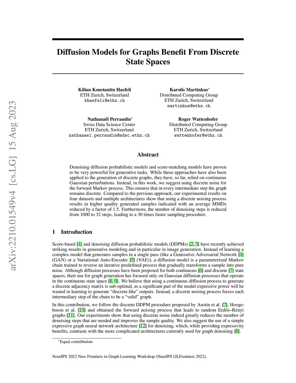 Denoising diffusion probabilistic models and score-matching models have proven to be very powerful for generative tasks. While these approaches have also been applied to the generation of discrete graphs, they have, so far, relied on continuous Gaussian perturbations. Instead, in this work, we suggest using discrete noise for the forward Markov process. This ensures that in every intermediate step the graph remains discrete. Compared to the previous approach, our experimental results on four datasets and multiple architectures show that using a discrete noising process results in higher quality generated samples indicated with an average MMDs reduced by a factor of 1.5. Furthermore, the number of denoising steps is reduced from 1000 to 32 steps, leading to a 30 times faster sampling procedure.