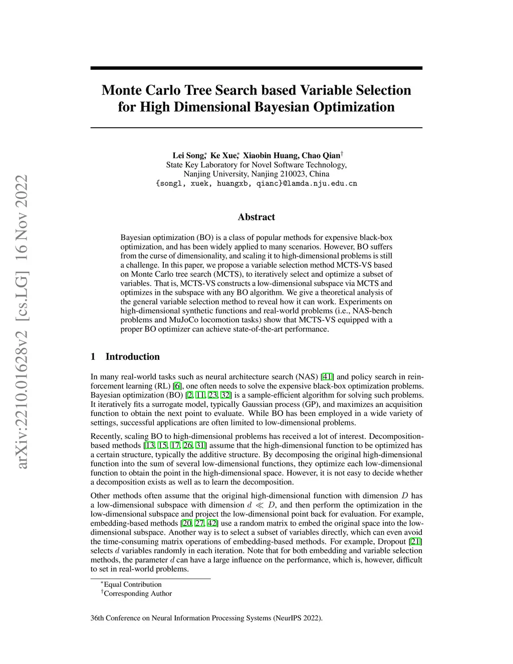 Bayesian optimization (BO) is a class of popular methods for expensive black-box optimization, and has been widely applied to many scenarios. However, BO suffers from the curse of dimensionality, and scaling it to high-dimensional problems is still a challenge. In this paper, we propose a variable selection method MCTS-VS based on Monte Carlo tree search (MCTS), to iteratively select and optimize a subset of variables. That is, MCTS-VS constructs a low-dimensional subspace via MCTS and optimizes in the subspace with any BO algorithm. We give a theoretical analysis of the general variable selection method to reveal how it can work. Experiments on high-dimensional synthetic functions and real-world problems (i.e., NAS-bench problems and MuJoCo locomotion tasks) show that MCTS-VS equipped with a proper BO optimizer can achieve state-of-the-art performance.