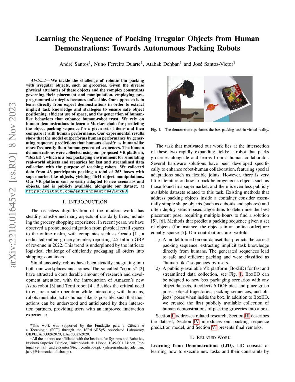 We tackle the challenge of robotic bin packing with irregular objects, such as groceries. Given the diverse physical attributes of these objects and the complex constraints governing their placement and manipulation, employing preprogrammed strategies becomes unfeasible. Our approach is to learn directly from expert demonstrations in order to extract implicit task knowledge and strategies to ensure safe object positioning, efficient use of space, and the generation of human-like behaviors that enhance human-robot trust. We rely on human demonstrations to learn a Markov chain for predicting the object packing sequence for a given set of items and then compare it with human performance. Our experimental results show that the model outperforms human performance by generating sequence predictions that humans classify as human-like more frequently than human-generated sequences. The human demonstrations were collected using our proposed VR platform, BoxED, which is a box packaging environment for simulating real-world objects and scenarios for fast and streamlined data collection with the purpose of teaching robots. We collected data from 43 participants packing a total of 263 boxes with supermarket-like objects, yielding 4644 object manipulations. Our VR platform can be easily adapted to new scenarios and objects, and is publicly available, alongside our dataset, at https://github.com/andrejfsantos4/BoxED.