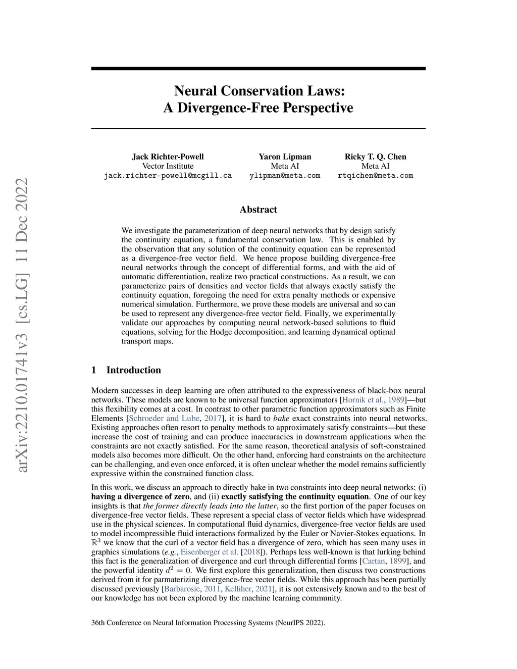 We investigate the parameterization of deep neural networks that by design satisfy the continuity equation, a fundamental conservation law. This is enabled by the observation that any solution of the continuity equation can be represented as a divergence-free vector field. We hence propose building divergence-free neural networks through the concept of differential forms, and with the aid of automatic differentiation, realize two practical constructions. As a result, we can parameterize pairs of densities and vector fields that always exactly satisfy the continuity equation, foregoing the need for extra penalty methods or expensive numerical simulation. Furthermore, we prove these models are universal and so can be used to represent any divergence-free vector field. Finally, we experimentally validate our approaches by computing neural network-based solutions to fluid equations, solving for the Hodge decomposition, and learning dynamical optimal transport maps.