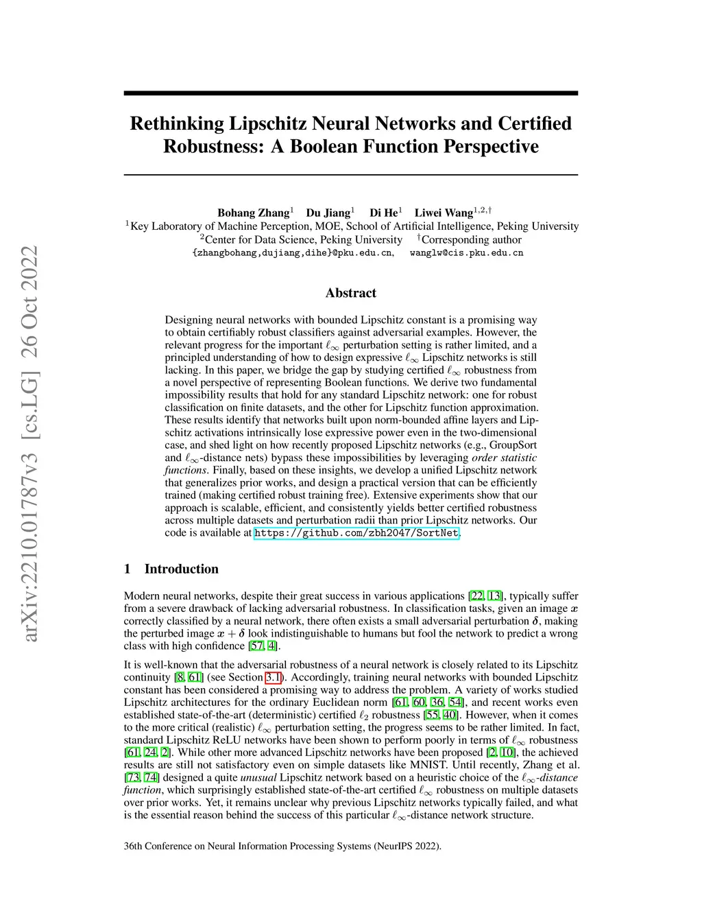 Designing neural networks with bounded Lipschitz constant is a promising way to obtain certifiably robust classifiers against adversarial examples. However, the relevant progress for the important perturbation setting is rather limited, and a principled understanding of how to design expressive Lipschitz networks is still lacking. In this paper, we bridge the gap by studying certified robustness from a novel perspective of representing Boolean functions. We derive two fundamental impossibility results that hold for any standard Lipschitz network: one for robust classification on finite datasets, and the other for Lipschitz function approximation. These results identify that networks built upon norm-bounded affine layers and Lipschitz activations intrinsically lose expressive power even in the two-dimensional case, and shed light on how recently proposed Lipschitz networks (e.g., GroupSort and -distance nets) bypass these impossibilities by leveraging order statistic functions. Finally, based on these insights, we develop a unified Lipschitz network that generalizes prior works, and design a practical version that can be efficiently trained (making certified robust training free). Extensive experiments show that our approach is scalable, efficient, and consistently yields better certified robustness across multiple datasets and perturbation radii than prior Lipschitz networks. Our code is available at https://github.com/zbh2047/SortNet.