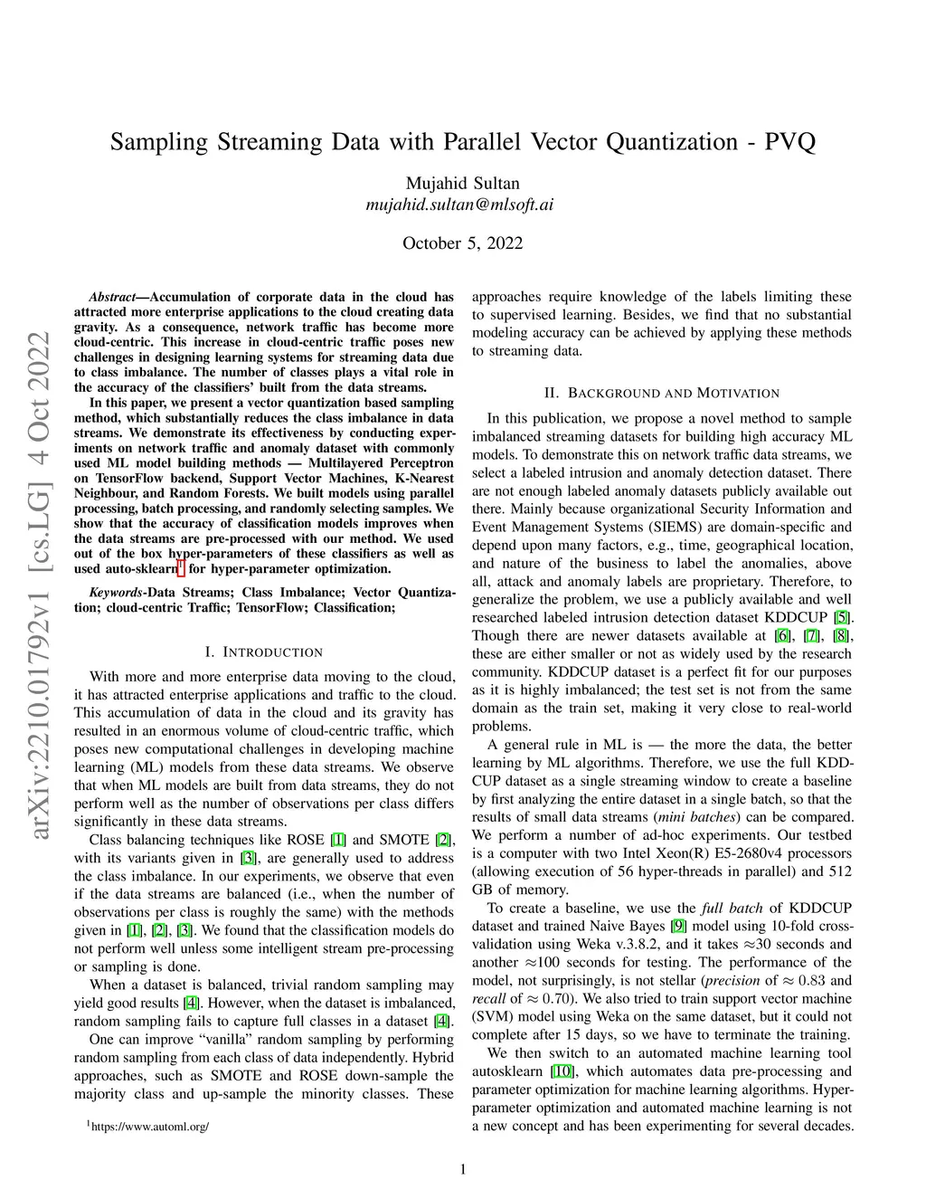 Accumulation of corporate data in the cloud has attracted more enterprise applications to the cloud creating data gravity. As a consequence, network traffic has become more cloud centric. This increase in cloud centric traffic poses new challenges in designing learning systems for streaming data due to class imbalance. The number of classes plays a vital role in the accuracy of the classifiers built from the data streams. In this paper, we present a vector quantization-based sampling method, which substantially reduces the class imbalance in data streams. We demonstrate its effectiveness by conducting experiments on network traffic and anomaly dataset with commonly used ML model building methods; Multilayered Perceptron on TensorFlow backend, Support Vector Machines, K-Nearest Neighbour, and Random Forests. We built models using parallel processing, batch processing, and randomly selecting samples. We show that the accuracy of classification models improves when the data streams are pre-processed with our method. We used out of the box hyper-parameters of these classifiers and auto sklearn for hyperparameter optimization.