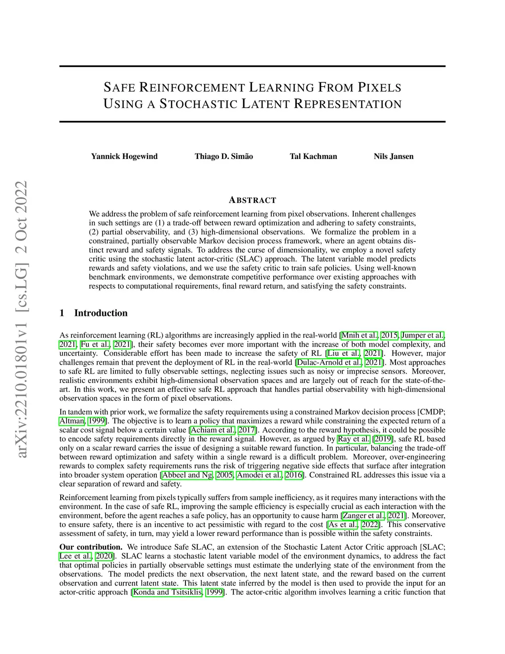 We address the problem of safe reinforcement learning from pixel observations. Inherent challenges in such settings are (1) a trade-off between reward optimization and adhering to safety constraints, (2) partial observability, and (3) high-dimensional observations. We formalize the problem in a constrained, partially observable Markov decision process framework, where an agent obtains distinct reward and safety signals. To address the curse of dimensionality, we employ a novel safety critic using the stochastic latent actor-critic (SLAC) approach. The latent variable model predicts rewards and safety violations, and we use the safety critic to train safe policies. Using well-known benchmark environments, we demonstrate competitive performance over existing approaches with respects to computational requirements, final reward return, and satisfying the safety constraints.