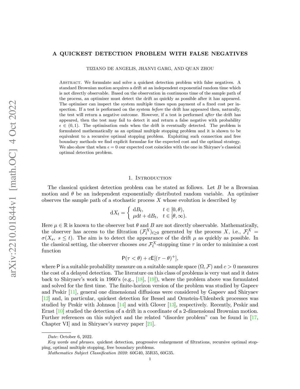 We formulate and solve a quickest detection problem with false negatives. A standard Brownian motion acquires a drift at an independent exponential random time which is not directly observable. Based on the observation in continuous time of the sample path of the process, an optimiser must detect the drift as quickly as possible after it has appeared. The optimiser can inspect the system multiple times upon payment of a fixed cost per inspection. If a test is performed on the system before the drift has appeared then, naturally, the test will return a negative outcome. However, if a test is performed after the drift has appeared, then the test may fail to detect it and return a false negative with probability . The optimisation ends when the drift is eventually detected. The problem is formulated mathematically as an optimal multiple stopping problem and it is shown to be equivalent to a recursive optimal stopping problem. Exploiting such connection and free boundary methods we find explicit formulae for the expected cost and the optimal strategy. We also show that when our expected cost coincides with the one in Shiryaev's classical optimal detection problem.