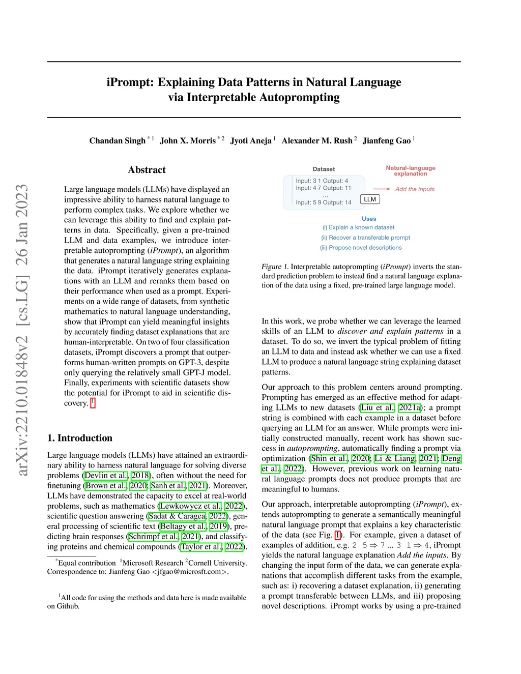 Large language models (LLMs) have displayed an impressive ability to harness natural language to perform complex tasks. In this work, we explore whether we can leverage this learned ability to find and explain patterns in data. Specifically, given a pre-trained LLM and data examples, we introduce interpretable autoprompting (iPrompt), an algorithm that generates a natural-language string explaining the data. iPrompt iteratively alternates between generating explanations with an LLM and reranking them based on their performance when used as a prompt. Experiments on a wide range of datasets, from synthetic mathematics to natural-language understanding, show that iPrompt can yield meaningful insights by accurately finding groundtruth dataset descriptions. Moreover, the prompts produced by iPrompt are simultaneously human-interpretable and highly effective for generalization: on real-world sentiment classification datasets, iPrompt produces prompts that match or even improve upon human-written prompts for GPT-3. Finally, experiments with an fMRI dataset show the potential for iPrompt to aid in scientific discovery. All code for using the methods and data here is made available on Github.