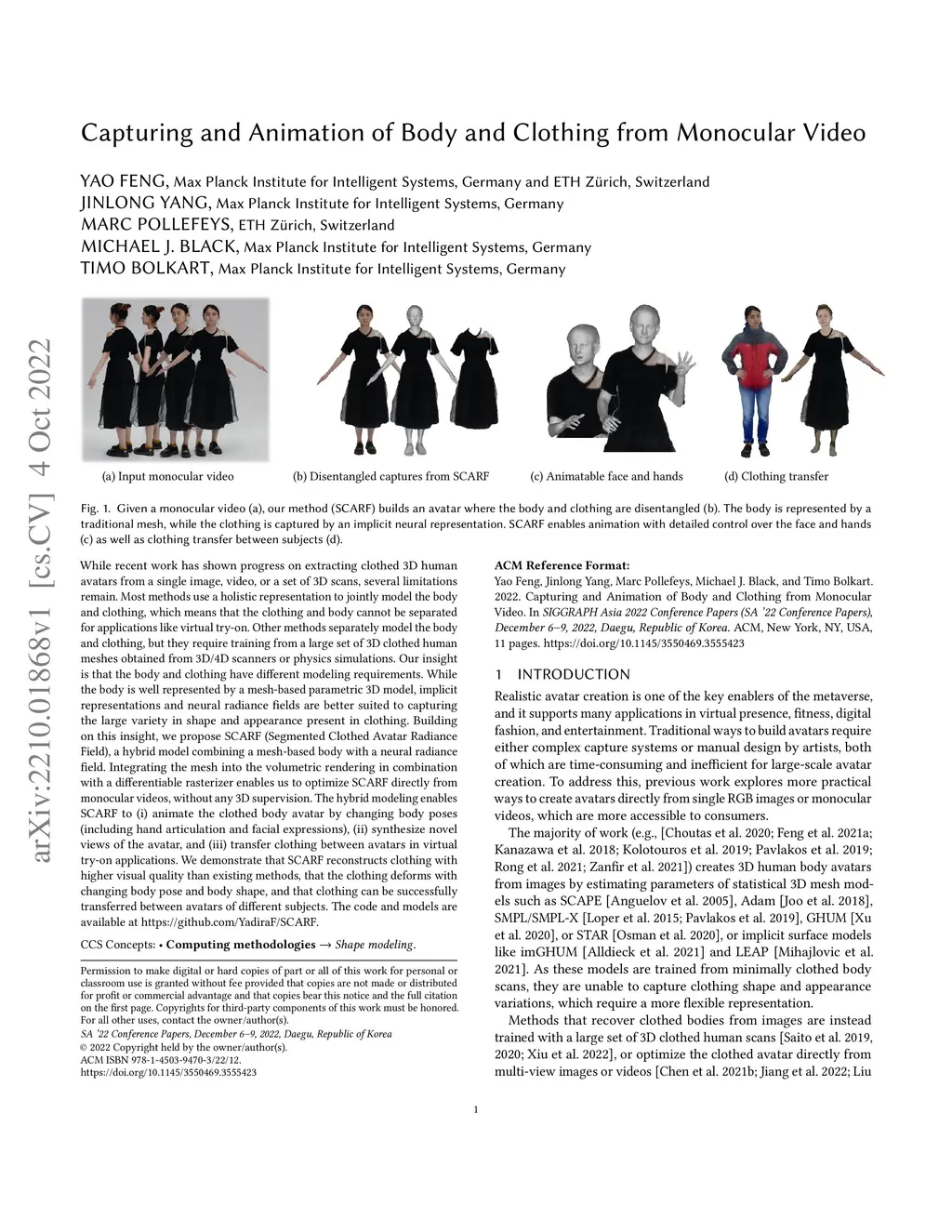 While recent work has shown progress on extracting clothed 3D human avatars from a single image, video, or a set of 3D scans, several limitations remain. Most methods use a holistic representation to jointly model the body and clothing, which means that the clothing and body cannot be separated for applications like virtual try-on. Other methods separately model the body and clothing, but they require training from a large set of 3D clothed human meshes obtained from 3D/4D scanners or physics simulations. Our insight is that the body and clothing have different modeling requirements. While the body is well represented by a mesh-based parametric 3D model, implicit representations and neural radiance fields are better suited to capturing the large variety in shape and appearance present in clothing. Building on this insight, we propose SCARF (Segmented Clothed Avatar Radiance Field), a hybrid model combining a mesh-based body with a neural radiance field. Integrating the mesh into the volumetric rendering in combination with a differentiable rasterizer enables us to optimize SCARF directly from monocular videos, without any 3D supervision. The hybrid modeling enables SCARF to (i) animate the clothed body avatar by changing body poses (including hand articulation and facial expressions), (ii) synthesize novel views of the avatar, and (iii) transfer clothing between avatars in virtual try-on applications. We demonstrate that SCARF reconstructs clothing with higher visual quality than existing methods, that the clothing deforms with changing body pose and body shape, and that clothing can be successfully transferred between avatars of different subjects. The code and models are available at https://github.com/YadiraF/SCARF.