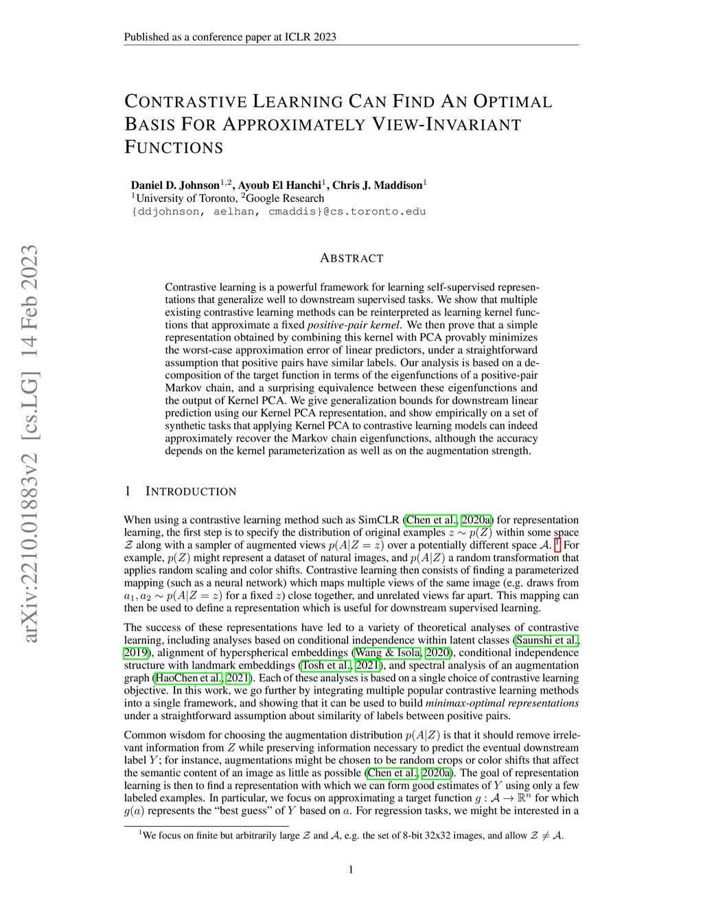 Contrastive learning is a powerful framework for learning self-supervised representations that generalize well to downstream supervised tasks. We show that multiple existing contrastive learning methods can be reinterpreted as learning kernel functions that approximate a fixed positive-pair kernel. We then prove that a simple representation obtained by combining this kernel with PCA provably minimizes the worst-case approximation error of linear predictors, under a straightforward assumption that positive pairs have similar labels. Our analysis is based on a decomposition of the target function in terms of the eigenfunctions of a positive-pair Markov chain, and a surprising equivalence between these eigenfunctions and the output of Kernel PCA. We give generalization bounds for downstream linear prediction using our Kernel PCA representation, and show empirically on a set of synthetic tasks that applying Kernel PCA to contrastive learning models can indeed approximately recover the Markov chain eigenfunctions, although the accuracy depends on the kernel parameterization as well as on the augmentation strength.