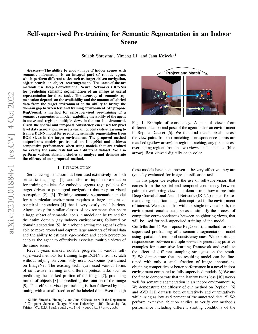 The ability to endow maps of indoor scenes with semantic information is an integral part of robotic agents which perform different tasks such as target driven navigation, object search or object rearrangement. The state-of-the-art methods use Deep Convolutional Neural Networks (DCNNs) for predicting semantic segmentation of an image as useful representation for these tasks. The accuracy of semantic segmentation depends on the availability and the amount of labeled data from the target environment or the ability to bridge the domain gap between test and training environment. We propose RegConsist, a method for self-supervised pre-training of a semantic segmentation model, exploiting the ability of the agent to move and register multiple views in the novel environment. Given the spatial and temporal consistency cues used for pixel level data association, we use a variant of contrastive learning to train a DCNN model for predicting semantic segmentation from RGB views in the target environment. The proposed method outperforms models pre-trained on ImageNet and achieves competitive performance when using models that are trained for exactly the same task but on a different dataset. We also perform various ablation studies to analyze and demonstrate the efficacy of our proposed method.