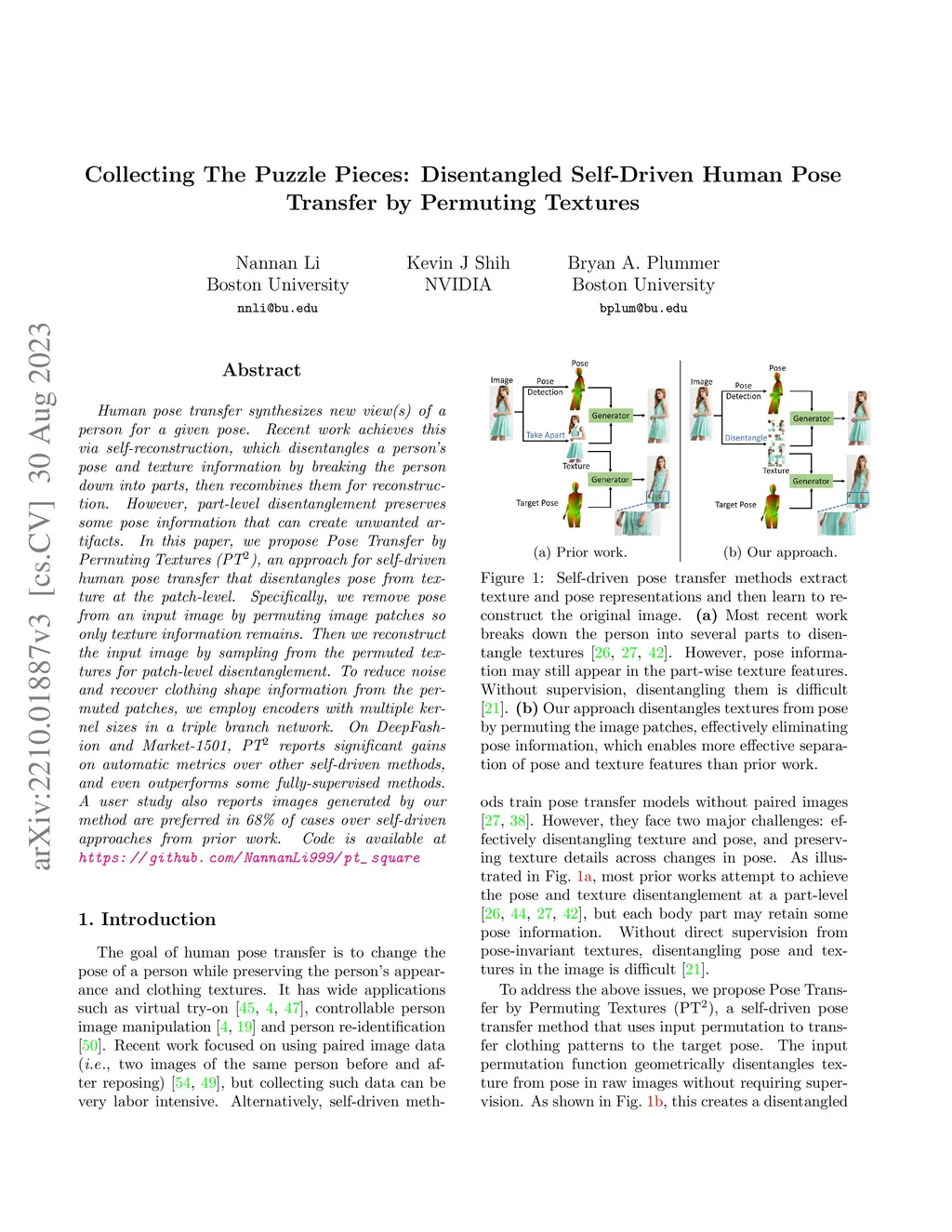 Human pose transfer synthesizes new view(s) of a person for a given pose. Recent work achieves this via self-reconstruction, which disentangles a person's pose and texture information by breaking the person down into parts, then recombines them for reconstruction. However, part-level disentanglement preserves some pose information that can create unwanted artifacts. In this paper, we propose Pose Transfer by Permuting Textures (PT), an approach for self-driven human pose transfer that disentangles pose from texture at the patch-level. Specifically, we remove pose from an input image by permuting image patches so only texture information remains. Then we reconstruct the input image by sampling from the permuted textures for patch-level disentanglement. To reduce noise and recover clothing shape information from the permuted patches, we employ encoders with multiple kernel sizes in a triple branch network. On DeepFashion and Market-1501, PT reports significant gains on automatic metrics over other self-driven methods, and even outperforms some fully-supervised methods. A user study also reports images generated by our method are preferred in 68% of cases over self-driven approaches from prior work. Code is available at https://github.com/NannanLi999/pt_square.