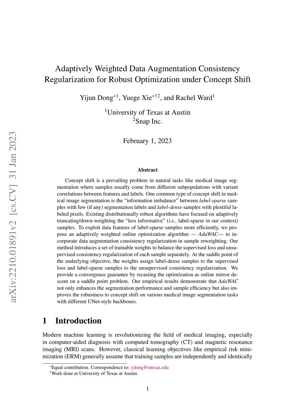 Concept shift is a prevailing problem in natural tasks like medical image segmentation where samples usually come from different subpopulations with variant correlations between features and labels. One common type of concept shift in medical image segmentation is the "information imbalance" between label-sparse samples with few (if any) segmentation labels and label-dense samples with plentiful labeled pixels. Existing distributionally robust algorithms have focused on adaptively truncating/down-weighting the "less informative" (i.e., label-sparse in our context) samples. To exploit data features of label-sparse samples more efficiently, we propose an adaptively weighted online optimization algorithm -- AdaWAC -- to incorporate data augmentation consistency regularization in sample reweighting. Our method introduces a set of trainable weights to balance the supervised loss and unsupervised consistency regularization of each sample separately. At the saddle point of the underlying objective, the weights assign label-dense samples to the supervised loss and label-sparse samples to the unsupervised consistency regularization. We provide a convergence guarantee by recasting the optimization as online mirror descent on a saddle point problem. Our empirical results demonstrate that AdaWAC not only enhances the segmentation performance and sample efficiency but also improves the robustness to concept shift on various medical image segmentation tasks with different UNet-style backbones.