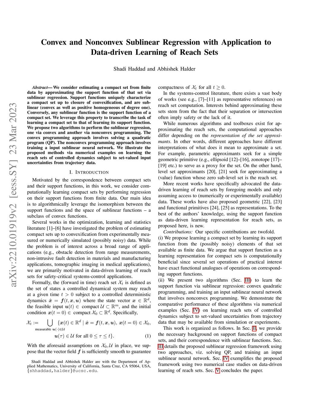 We consider estimating a compact set from finite data by approximating the support function of that set via sublinear regression. Support functions uniquely characterize a compact set up to closure of convexification, and are sublinear (convex as well as positive homogeneous of degree one). Conversely, any sublinear function is the support function of a compact set. We leverage this property to transcribe the task of learning a compact set to that of learning its support function. We propose two algorithms to perform the sublinear regression, one via convex and another via nonconvex programming. The convex programming approach involves solving a quadratic program (QP) followed by a linear program (LP), and is referred to as QP-LP. The nonconvex programming approach involves training a input sublinear neural network. We illustrate the proposed methods via numerical examples on learning the reach sets of controlled dynamics subject to set-valued input uncertainties from trajectory data.