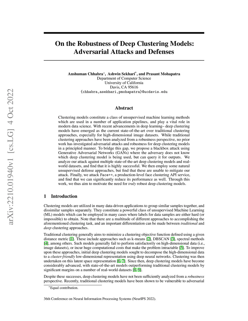 Clustering models constitute a class of unsupervised machine learning methods which are used in a number of application pipelines, and play a vital role in modern data science. With recent advancements in deep learning -- deep clustering models have emerged as the current state-of-the-art over traditional clustering approaches, especially for high-dimensional image datasets. While traditional clustering approaches have been analyzed from a robustness perspective, no prior work has investigated adversarial attacks and robustness for deep clustering models in a principled manner. To bridge this gap, we propose a blackbox attack using Generative Adversarial Networks (GANs) where the adversary does not know which deep clustering model is being used, but can query it for outputs. We analyze our attack against multiple state-of-the-art deep clustering models and real-world datasets, and find that it is highly successful. We then employ some natural unsupervised defense approaches, but find that these are unable to mitigate our attack. Finally, we attack Face++, a production-level face clustering API service, and find that we can significantly reduce its performance as well. Through this work, we thus aim to motivate the need for truly robust deep clustering models.
