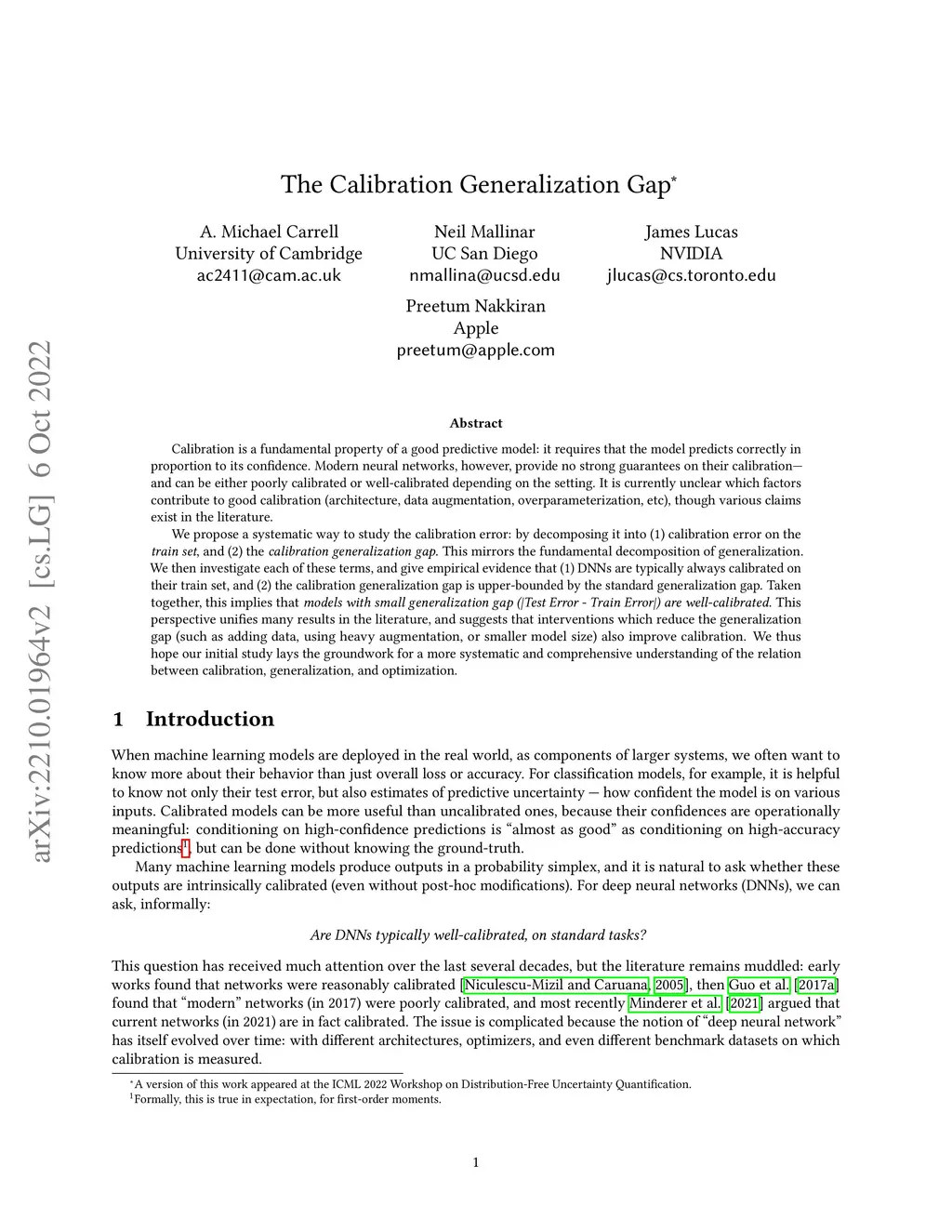 Calibration is a fundamental property of a good predictive model: it requires that the model predicts correctly in proportion to its confidence. Modern neural networks, however, provide no strong guarantees on their calibration -- and can be either poorly calibrated or well-calibrated depending on the setting. It is currently unclear which factors contribute to good calibration (architecture, data augmentation, overparameterization, etc), though various claims exist in the literature. We propose a systematic way to study the calibration error: by decomposing it into (1) calibration error on the train set, and (2) the calibration generalization gap. This mirrors the fundamental decomposition of generalization. We then investigate each of these terms, and give empirical evidence that (1) DNNs are typically always calibrated on their train set, and (2) the calibration generalization gap is upper-bounded by the standard generalization gap. Taken together, this implies that models with small generalization gap (|Test Error - Train Error|) are well-calibrated. This perspective unifies many results in the literature, and suggests that interventions which reduce the generalization gap (such as adding data, using heavy augmentation, or smaller model size) also improve calibration. We thus hope our initial study lays the groundwork for a more systematic and comprehensive understanding of the relation between calibration, generalization, and optimization.