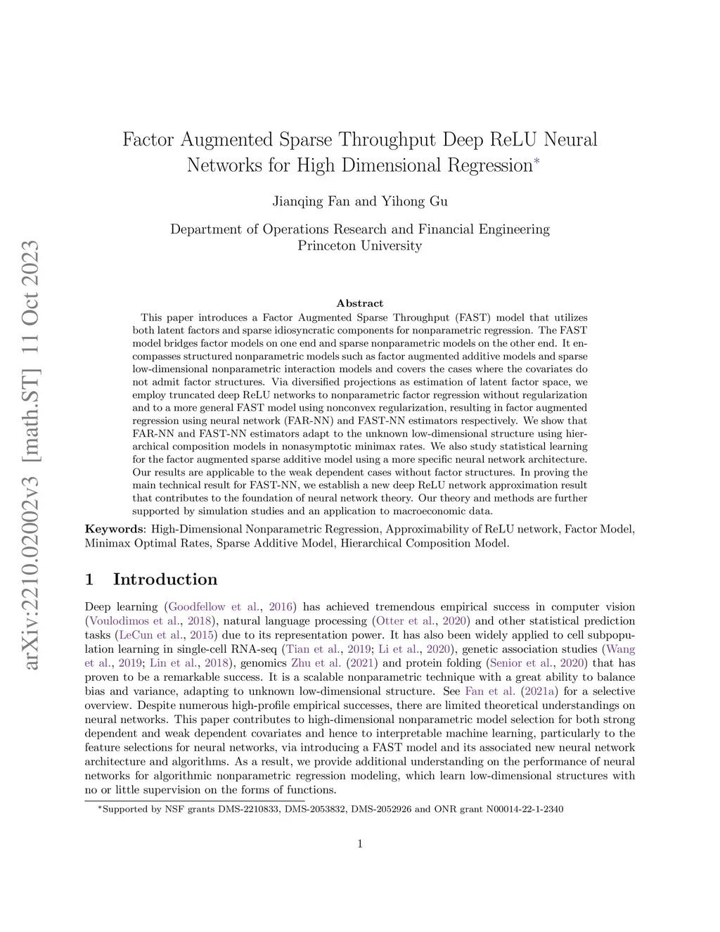 This paper introduces a Factor Augmented Sparse Throughput (FAST) model that utilizes both latent factors and sparse idiosyncratic components for nonparametric regression. The FAST model bridges factor models on one end and sparse nonparametric models on the other end. It encompasses structured nonparametric models such as factor augmented additive models and sparse low-dimensional nonparametric interaction models and covers the cases where the covariates do not admit factor structures. Via diversified projections as estimation of latent factor space, we employ truncated deep ReLU networks to nonparametric factor regression without regularization and to a more general FAST model using nonconvex regularization, resulting in factor augmented regression using neural network (FAR-NN) and FAST-NN estimators respectively. We show that FAR-NN and FAST-NN estimators adapt to the unknown low-dimensional structure using hierarchical composition models in nonasymptotic minimax rates. We also study statistical learning for the factor augmented sparse additive model using a more specific neural network architecture. Our results are applicable to the weak dependent cases without factor structures. In proving the main technical result for FAST-NN, we establish a new deep ReLU network approximation result that contributes to the foundation of neural network theory. Our theory and methods are further supported by simulation studies and an application to macroeconomic data.